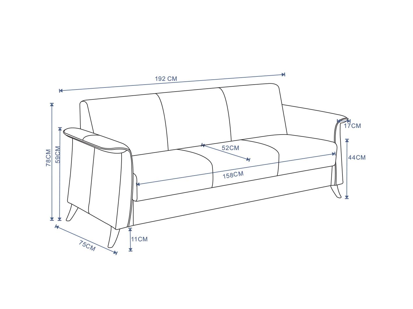 • الأبعاد: العرض 192 سم × العمق 75 سم × الارتفاع 78 سم
