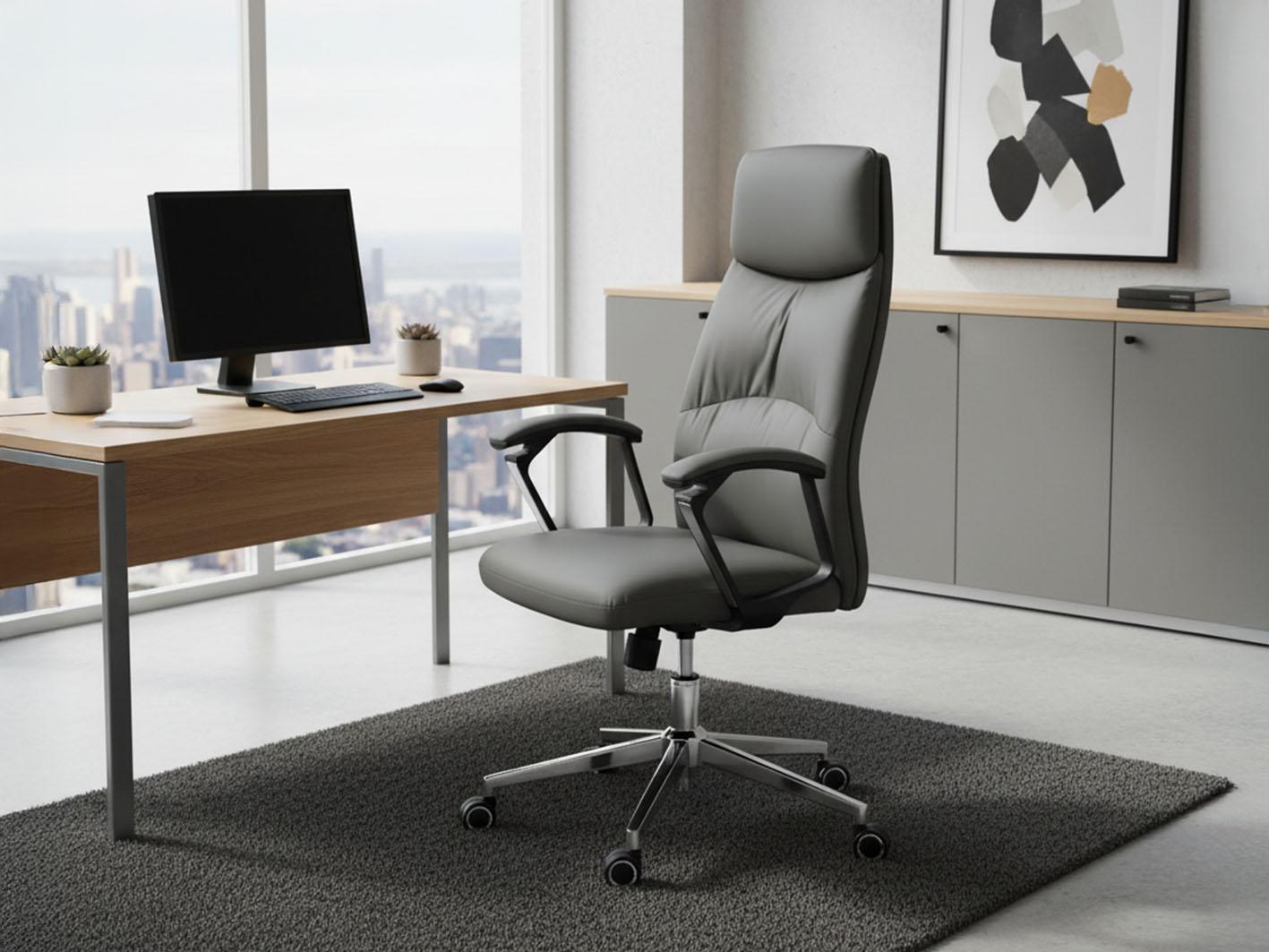 ارتقِ بتجربة الجلوس في مكتبك مع كرسي مكتب جلد رمادي ألفا بمسند الظهر العالي، المصمم للمهنيين والمديرين التنفيذيين الذين يقدرون الراحة والفخامة. يجمع الكرسي بين التصميم العصري والأداء العملي، ليكون خيارًا مثاليًا لتحقيق أقصى درجات الراحة أثناء ساعات العمل الطويلة.