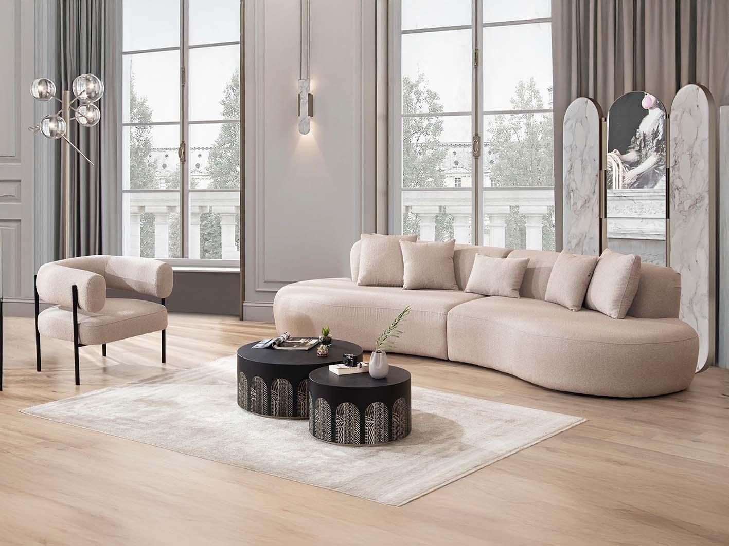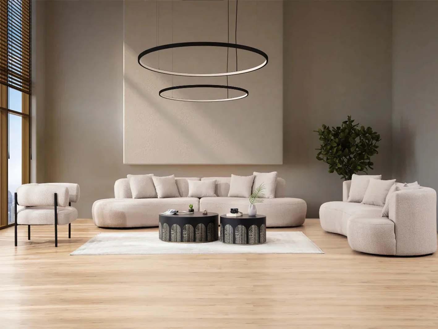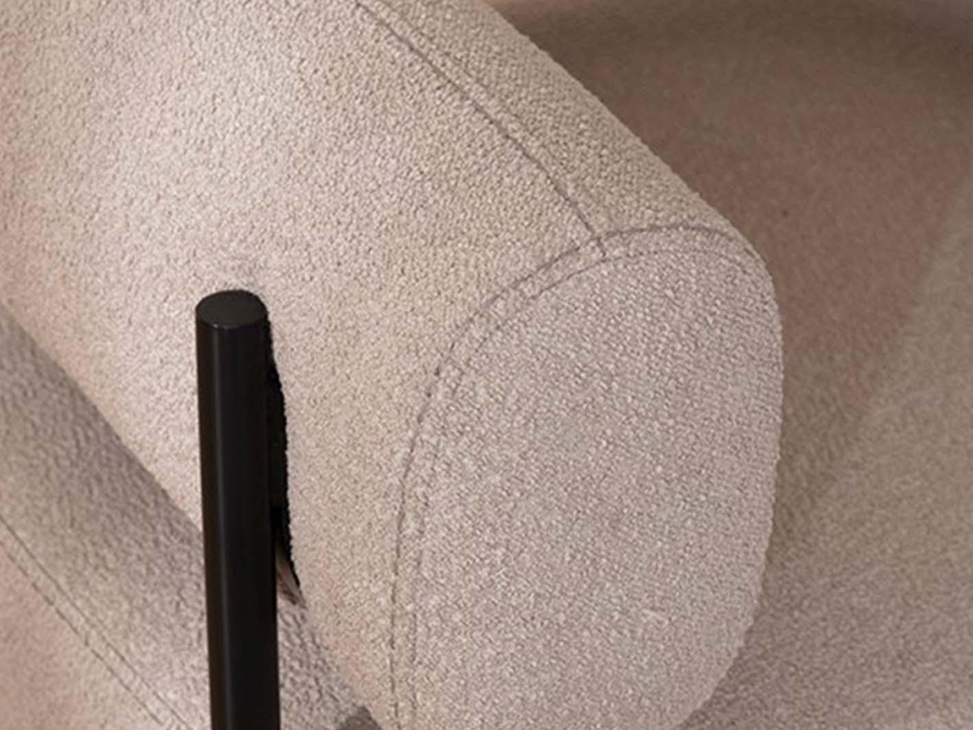 تم تنجيد الكنب بقماش البوكليه الفاخر، وهو نسيج منسوج بخيوط غير منتظمة الشكل تمنحه مظهراً غنياً وملمسًا ناعماً يشبه الحلقات المتشابكة. هذا القماش الفريد لا يعزز فقط من جمال الكنب، بل يضيف أيضًا لمسة دافئة وأنيقة تعكس الذوق الرفيع. كما أنه يتميز بمتانته العالية وسهولة تنظيفه، مما يجعله عمليًا وأنيقًا في آنٍ واحد.