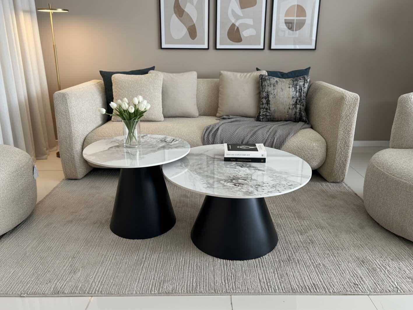 يأتي الطقم مكونًا من قطعتين دائرية بأحجام مختلفة، مما يمنحك مرونة في ترتيب الطاولات حسب المساحة المتوفرة لديك. يمكنك وضعها متقاربة لتكوين شكل مركزي أنيق في غرفة المعيشة، أو توزيعها بشكل منفصل لتكون نقاط جذب في أركان الغرفة. هذا الترتيب المتعدد الاستخدامات يجعل الطقم مثاليًا للمساحات الصغيرة والكبيرة على حد سواء.
