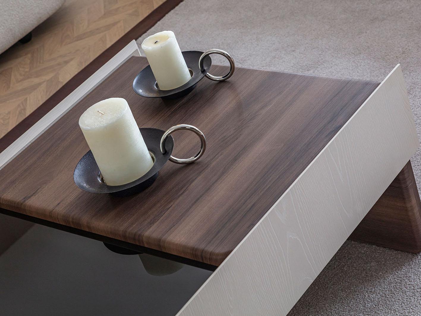 1. تصميم عصري وجذاب: تتميز الطاولة بخطوطها البسيطة والأنيقة مع مزيج متناغم من الألوان والخامات التي تضفي طابعًا راقيًا على المساحة.