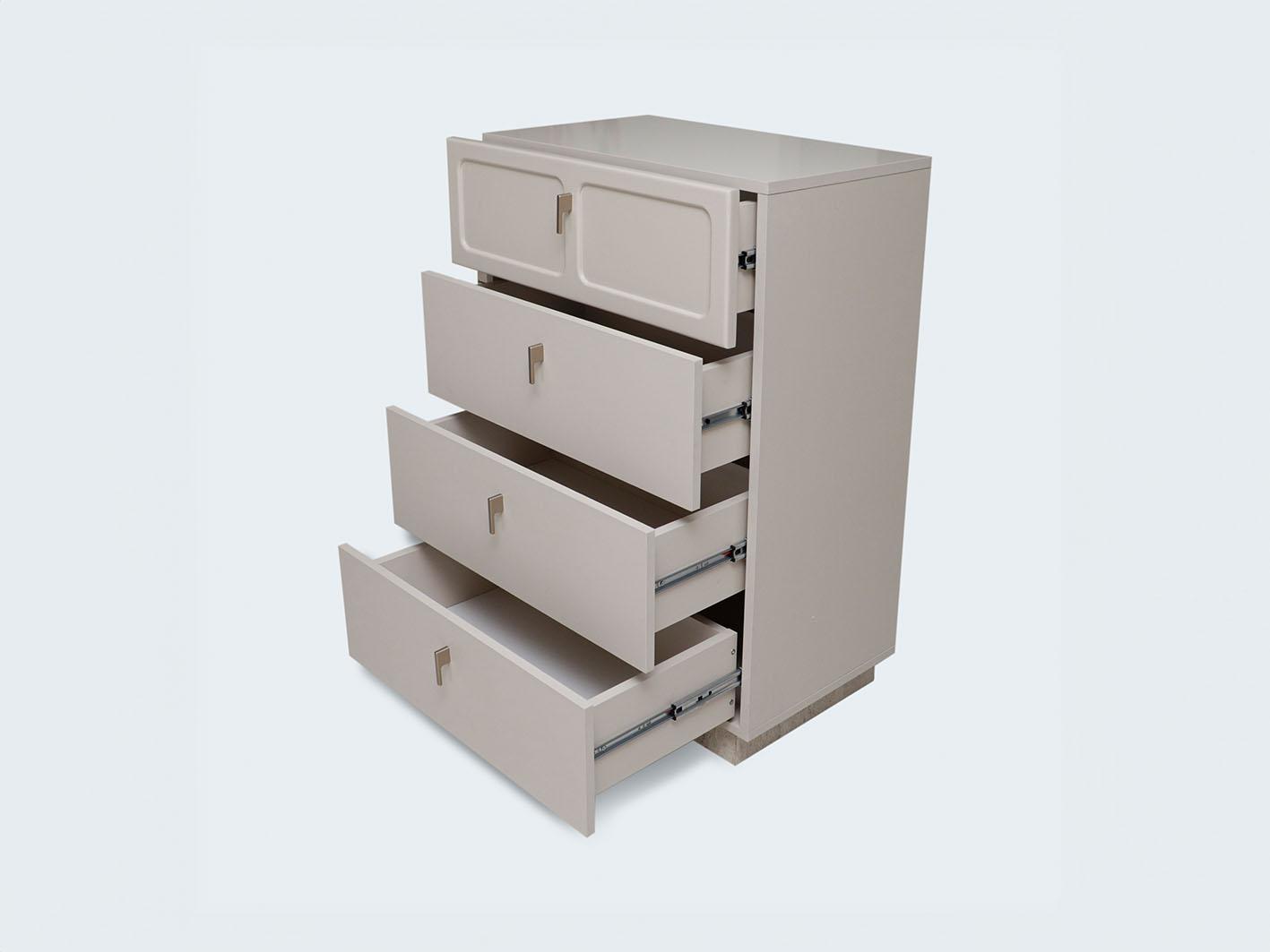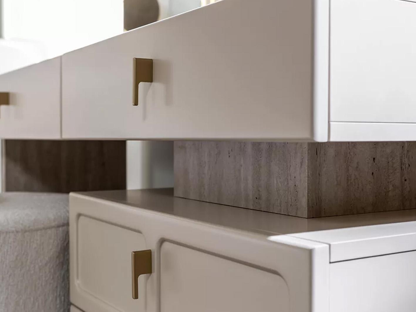 تم تصنيع هذا الطقم من خشب MDF عالي الجودة، مع تشطيب ميلامين يجعله مقاومًا للرطوبة والحرارة والحشرات والسوائل، مما يضمن لك عمرًا طويلاً للطقم دون الحاجة للقلق بشأن الصيانة المستمرة. الأرجل المعدنية والمقابض الذهبية تعزز من متانة الطقم وتضفي لمسة راقية لا مثيل لها.