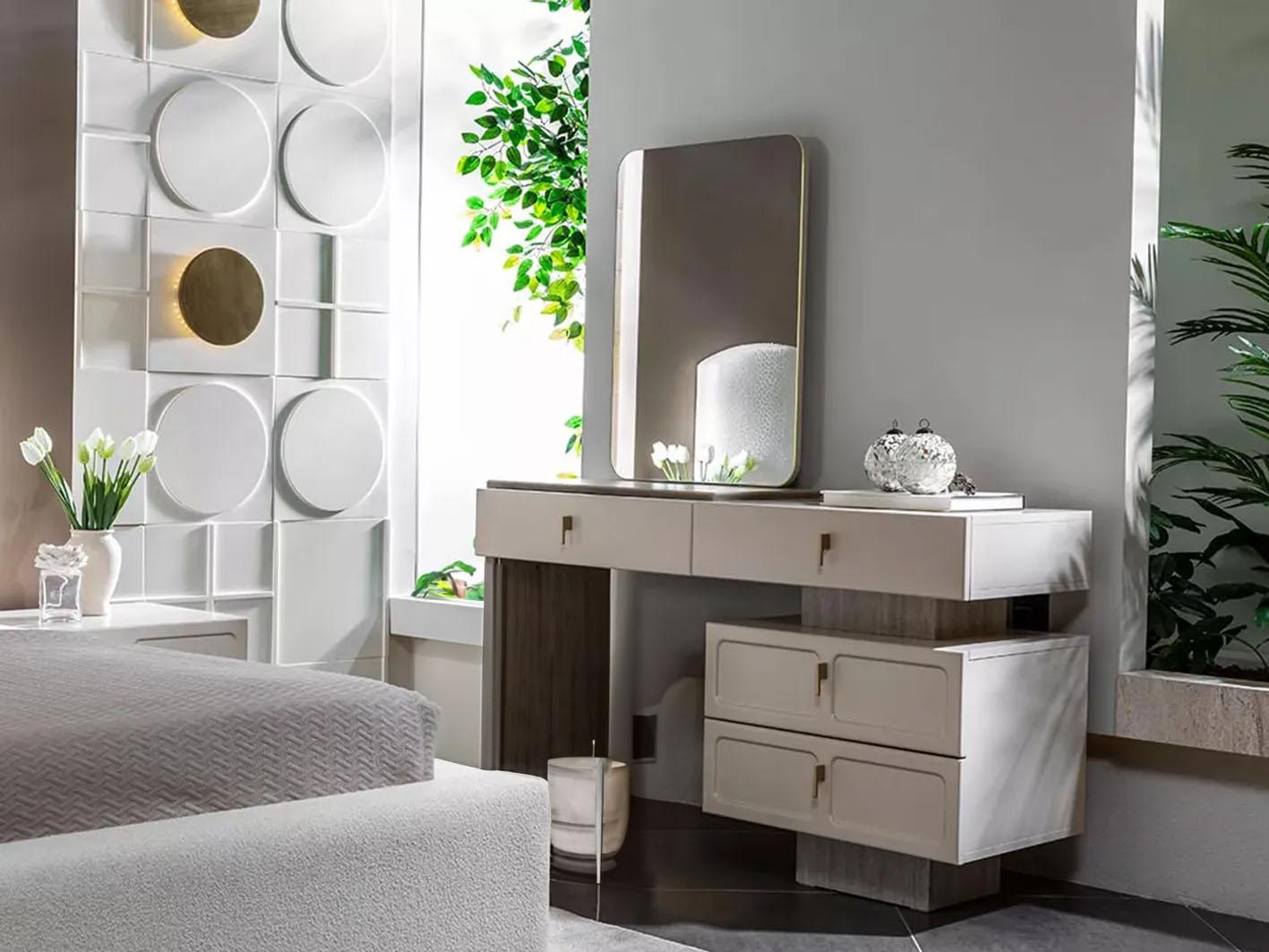 وظائف متكاملة: يحتوي على طاولتي سرير جانبيتين، وحدة أدراج، وتسريحة مع مرآة.