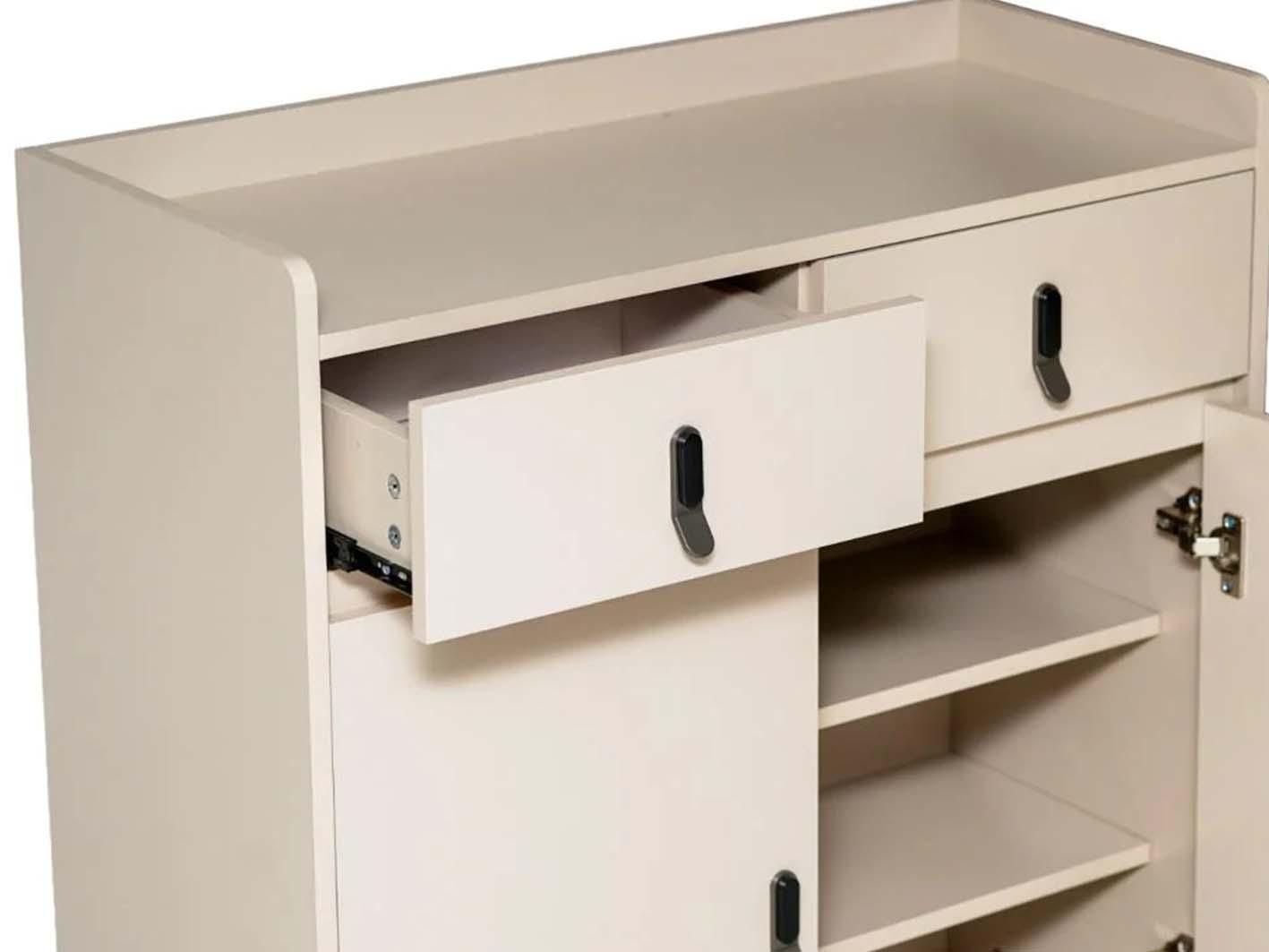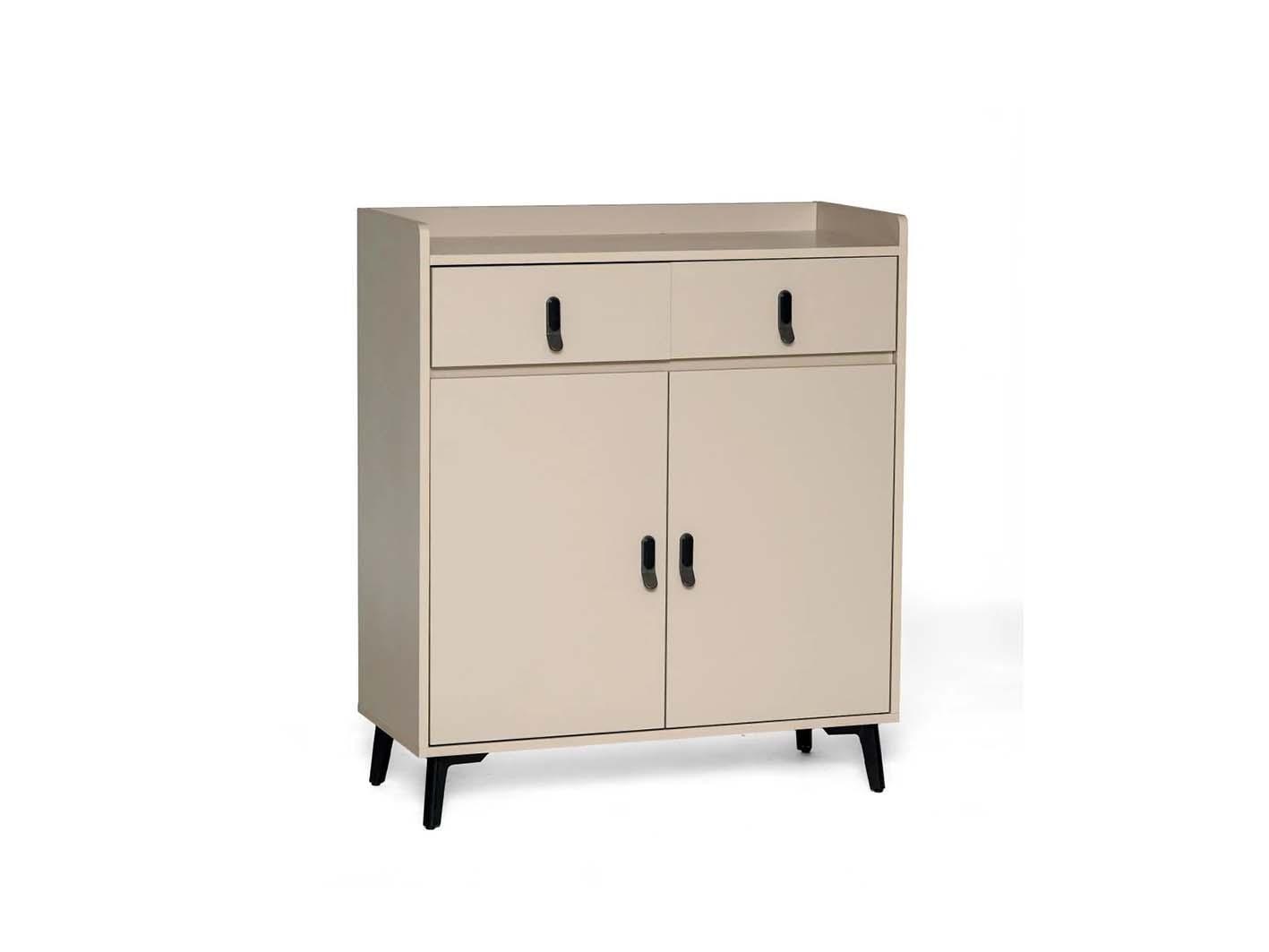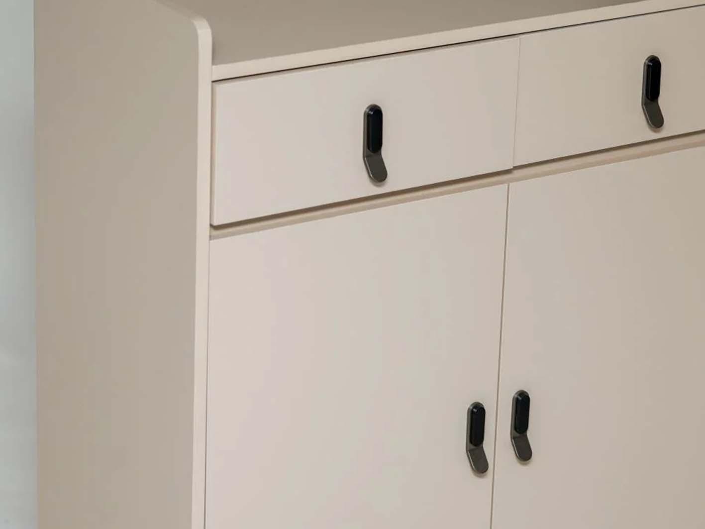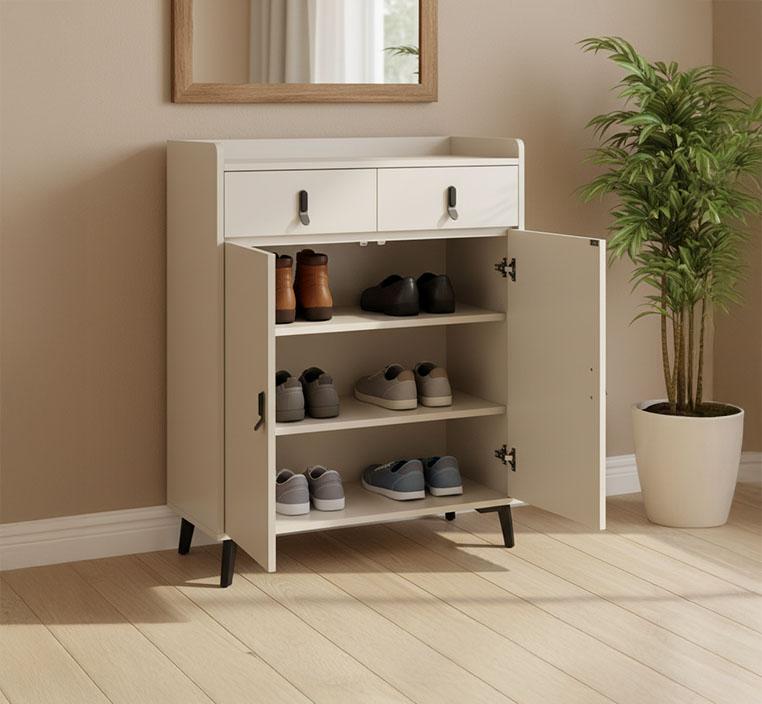يحتوي الدولاب على بابين أماميين يفتحان بسهولة، بالإضافة إلى درجين لتخزين الإكسسوارات أو الأحذية الصغيرة بشكل منظم. يحافظ هذا التصميم على شكل مرتب وموحّد ويحمي الأحذية من الغبار والعوامل الخارجية.