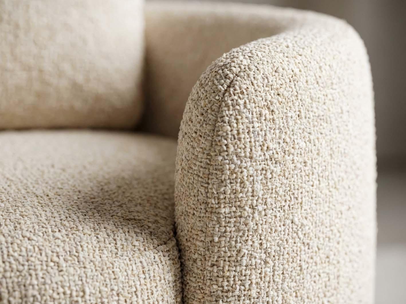 يأتي الكنب بتنجيد مصنوع من قماش الكتان الذي يتميز بمتانته وملمسه المريح. يمنح الكتان إحساسًا طبيعيًا ودفئًا داخل الغرفة، إضافة إلى مظهره الهادئ الذي يعزز الإحساس بالاسترخاء. كما يأتي الكنب مع وسادة واحدة توفر دعمًا إضافيًا للظهر وتضيف لمسة جمالية إلى التصميم.