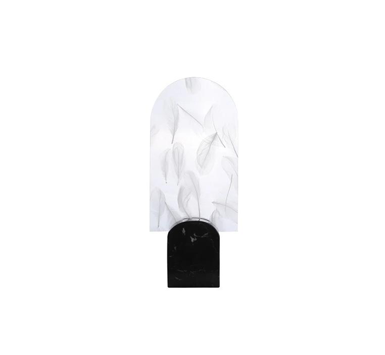 أضف لمسة من الفخامة والرقي إلى منزلك أو مكتبك مع تحفتنا الديكورية المصممة بعناية. صممت هذه التحفة لتكون مركز الاهتمام في أي غرفة، بفضل تصميمها الراقي والجذاب الذي يجمع بين البساطة والأناقة في تناغم مثالي.تتميز التحفة بتصميم نصف قوس فريد من نوعه، مع قاعدة من الرخام الأسود الأنيق وجزء علوي من مادة الاكريلك المزخرف بنقوش الريش الرمادية الرقيقة.