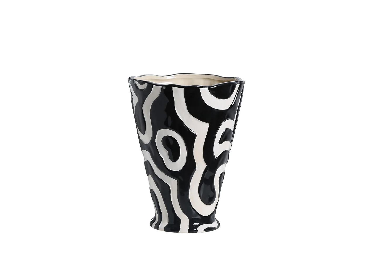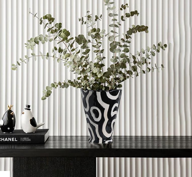 استمتع بجمال الفازة الأنيقة والفريدة من نوعها هذه. تتميز الفازة بتصميمها الملفت الذي يتميز بنمط ملتو باللونين الأبيض والأسود، والذي يضفي عليها جاذبية خاصة. تتسم الفازة أيضا بسطحها الناعم المميز حيث أنها مصنوعة من السيراميك الفاخر، مما يعطيها مظهرا فريدا ومميزا. تأتي الفازة بشكل مستدير مع فتحة واسعة في الأعلى وعنق ضيق، مما يمنحها مظهرا طويلا وأنيقا.اجعل هذه الفازة الرائعة تكون جزءًا من تجميعتك المنزلية أو هدية مميزة لشخص عزيز.
