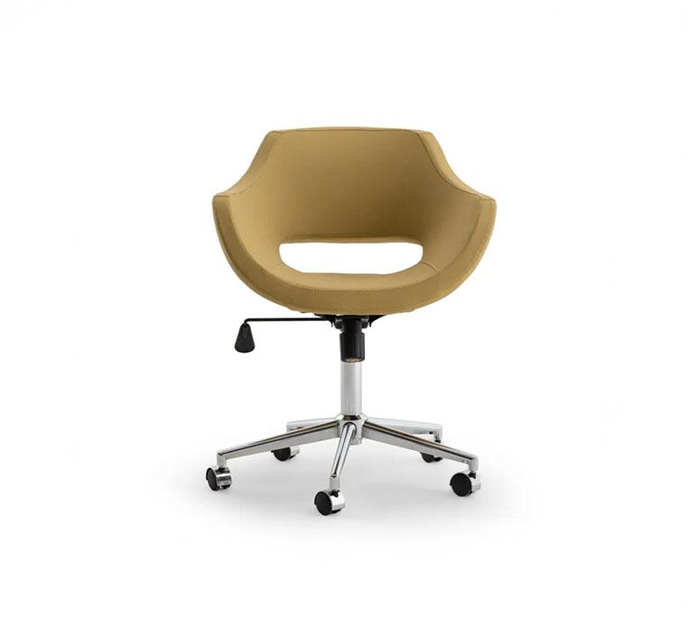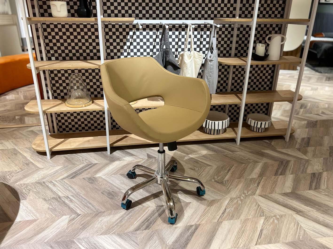 بفضل خاماته عالية الجودة، يأتي الكرسي بهيكل صب إسفنجي من مادة البولي يوريثين أحادية الكتلة، مما يمنح المقعد متانة وشكلًا ثابتًا لا يتأثر بالاستخدام المتكرر. كما أن القماش الجلدي المصنوع من البوليستر بلونه البني الفاتح يضيف لمسة دفء وهدوء إلى أجواء الغرفة.