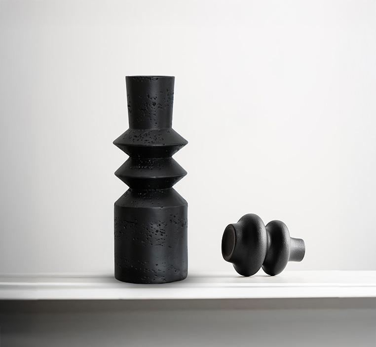 حامل شموع سيراميكي أنيق ومتميز. تصميمه الحائر بين الأشكال الهندسية والأشكال العضوية يضفي لمسة من الأناقة والتفرد. السطح الاسود المحفور بنمط متناسق يمنح هذه القطعة رونقًا وشخصية خاصة. سيكون هذا الحامل إضافة جمالية رائعة لأي طاولة أو رف، سواء لإضافة شموع أو اعتباره قطعة ديكورية بحد ذاتها. إنه يوازن بشكل مثير للإعجاب بين البساطة والتعقيد، ما يجعله قطعة فنية رائعة تثري المساحة المحيطة بها.