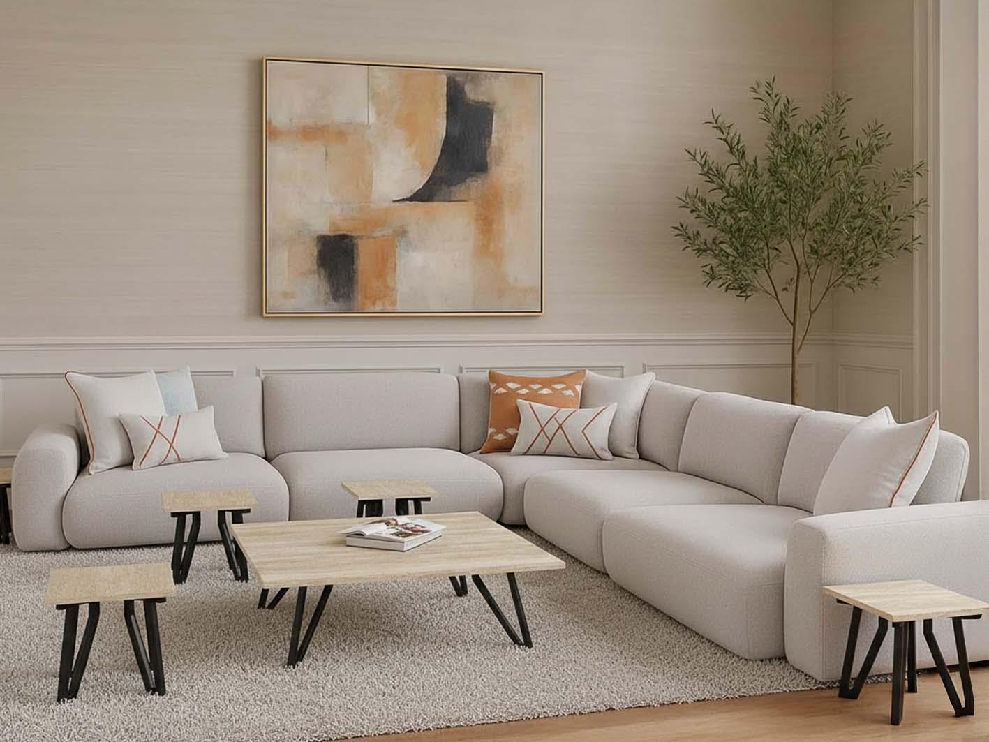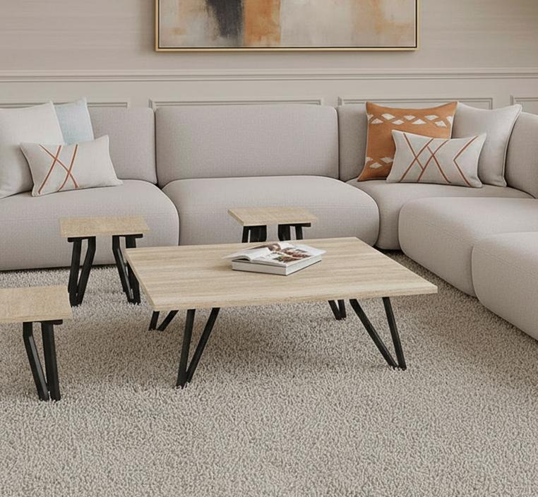 يأتي الطقم بتصميم مكون من خمس قطع تتكامل معًا لتوفر لك مرونة في الاستخدام وتنوعًا في الترتيب بما يناسب ذوقك ومساحة المكان. تتميز الطاولات بشكلها المربع الأنيق الذي يمنح تنسيق الجلسة مظهرًا متناغمًا، بينما تضفي الأرجل المعدنية بلونها الأسود طابعًا ميتاليك عصريًا يبرز جاذبية التصميم.