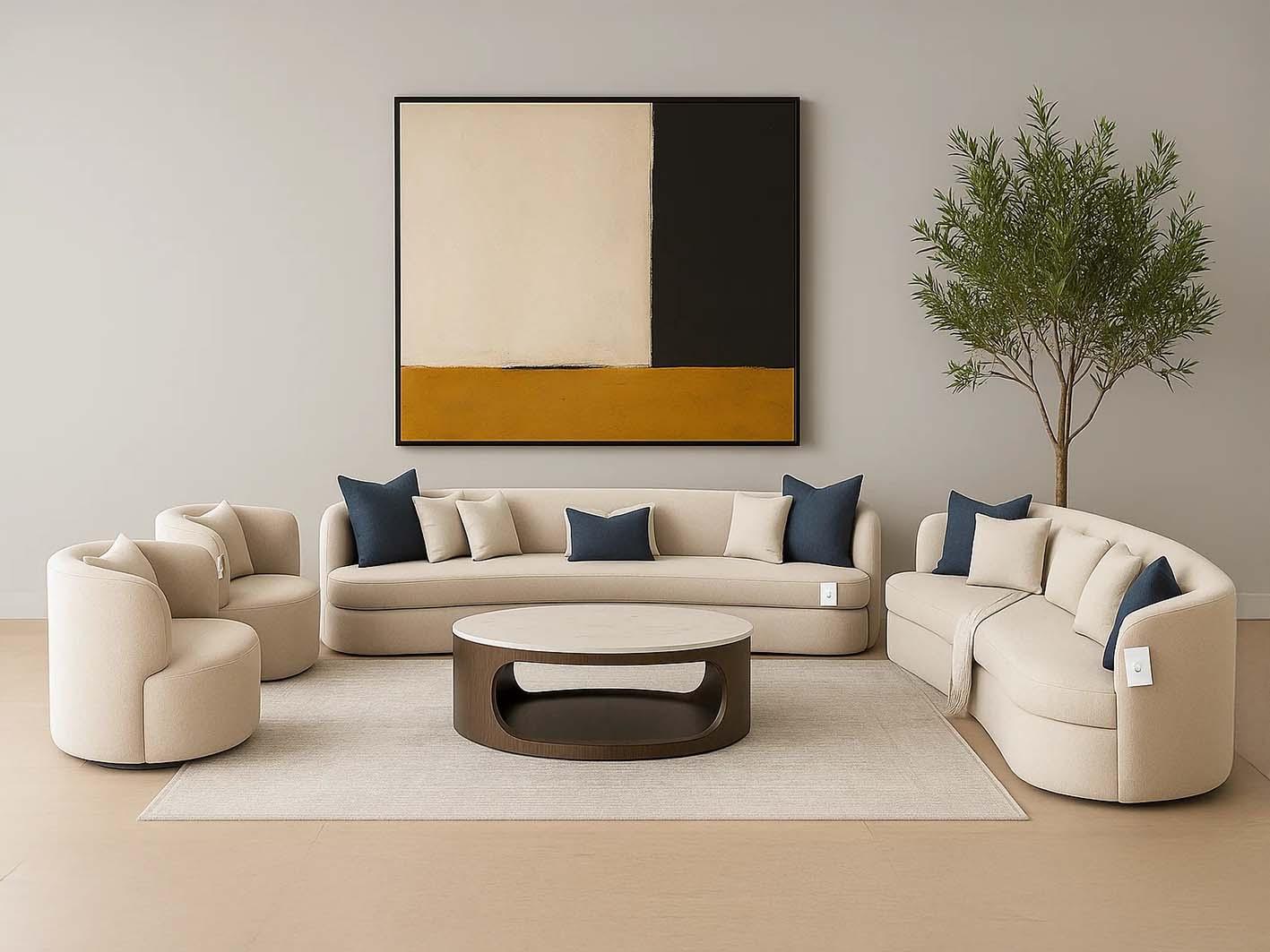 يتميز الكنب بخطوطه الانسيابية التي تمنح المكان شعورًا بالهدوء والتناغم. التصميم المدروس يجمع بين البساطة والأناقة في آنٍ واحد، ما يجعل الكنب قطعة مركزية تضيف لمسة راقية لديكورك. النهايات المنحنية والتفاصيل الدقيقة تعزز من جمالية الشكل العام.