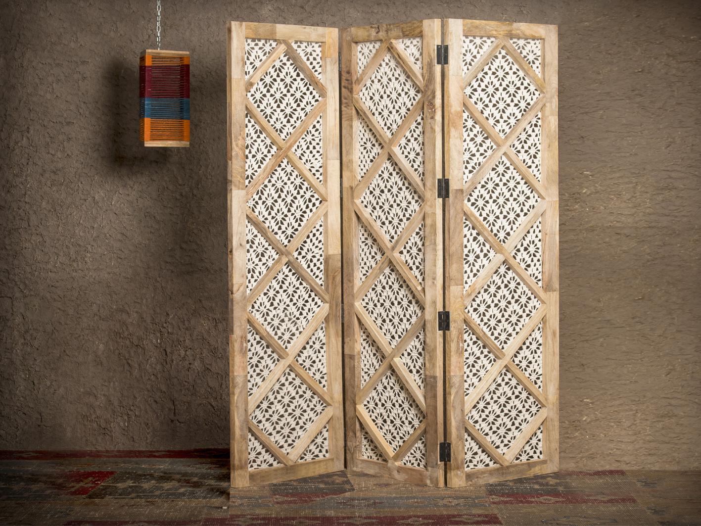 قاطع فربنا المميز في تصميمه يأتيك هذا القاطع أو المقسم بثلاث ألواح بشكل هندسي مصنوعة من خشب شجرة المانجو الطبيعية وخيوط القطن المنسوجة بداخلة مناسب هذا القاطع القابل لطي لتحديد المساحات الضيقة أو كتقسيم لغرفتك بشكل مثالي مناسب وملائم لأغلب قطع الأثاث.