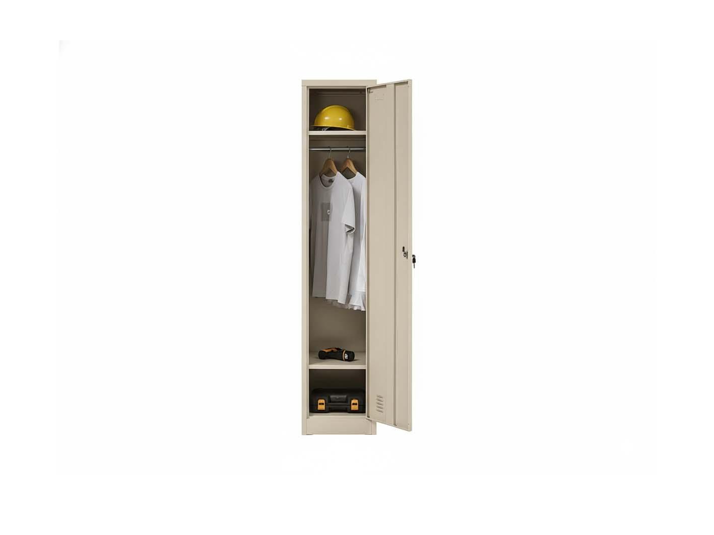 يحتوي التصميم على عمود تعليق داخلي لتعليق المعاطف، السترات، أو الزي الرسمي، مما يمنع تجعد الملابس ويحافظ على مظهرها مرتبًا وأنيقًا. هذه الميزة أساسية للعمال الذين يحتاجون إلى ملابس نظيفة ومرتبة يوميًا.