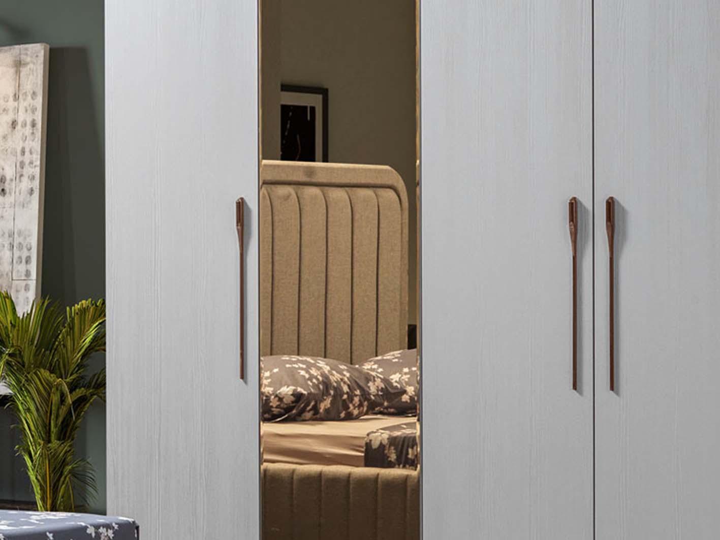 يأتيك الدولاب بستة أبواب مصممة لتتناسب مع كافة الاحتياجات، مع مرآتين أنيقتين في المنتصف تضيفان عمقًا بصريًا للمساحة وتعكسان الضوء بطريقة تزيد من إشراق الغرفة. كما أنها تمنحك الراحة أثناء اختيار ملابسك أو تنسيق إطلالتك اليومية.