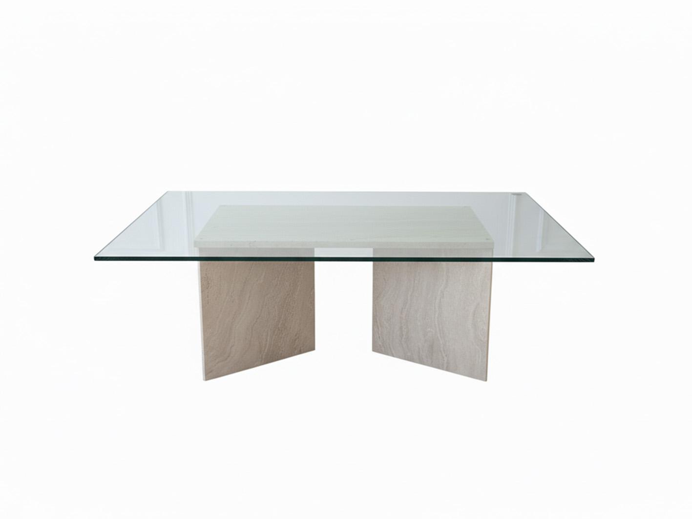 تم تصميم القاعدة من رخام الترافرتين الفاخر بلونه الهادئ ونقوشه الطبيعية التي تجعل كل قطعة فريدة في تفاصيلها. هذا الحجر الطبيعي لا يضيف فقط الجمال، بل يمنح الطاولة ثباتًا ومتانة تدوم لسنوات طويلة.