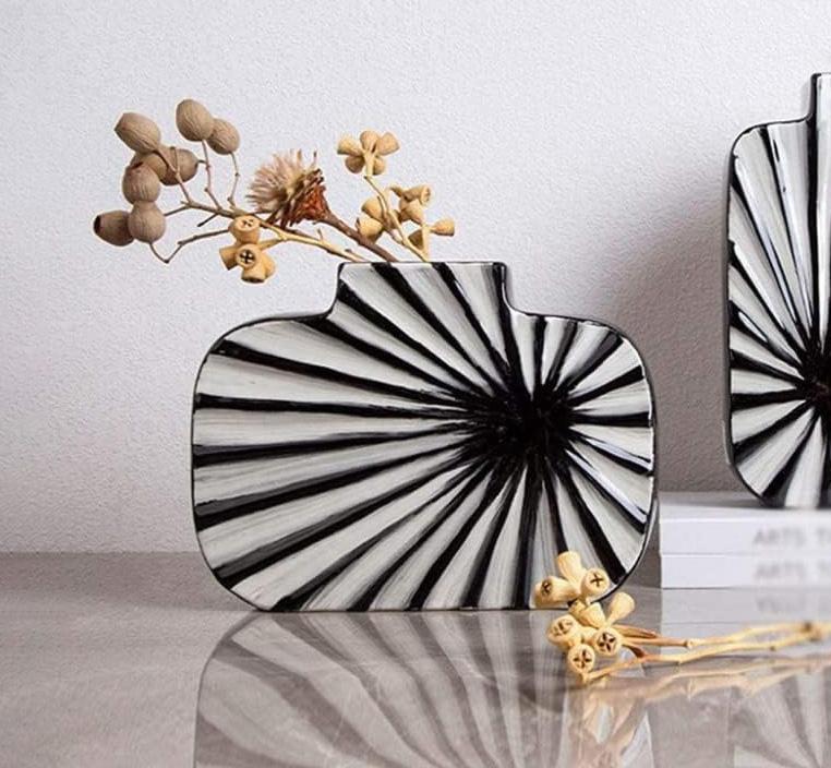 استمتع بإضافة هذه المزهرية الفريدة والأنيقة إلى تصاميمك الداخلية.تصميمها المميز من السيراميك المزخرف باللون الابيض والاسود سيضفي لمسة من الأناقة على أي غرفة. تعمل بساطة التصميم والتباين في الألوان على خلق جو جذاب ومهدئ للعين. يتيح لك التنوع في استخدامها وضعها في مختلف البيئات، من غرف المعيشة إلى مناطق تناول الطعام، مما يجعلها إضافة متعددة الاستخدامات لأي منزل.