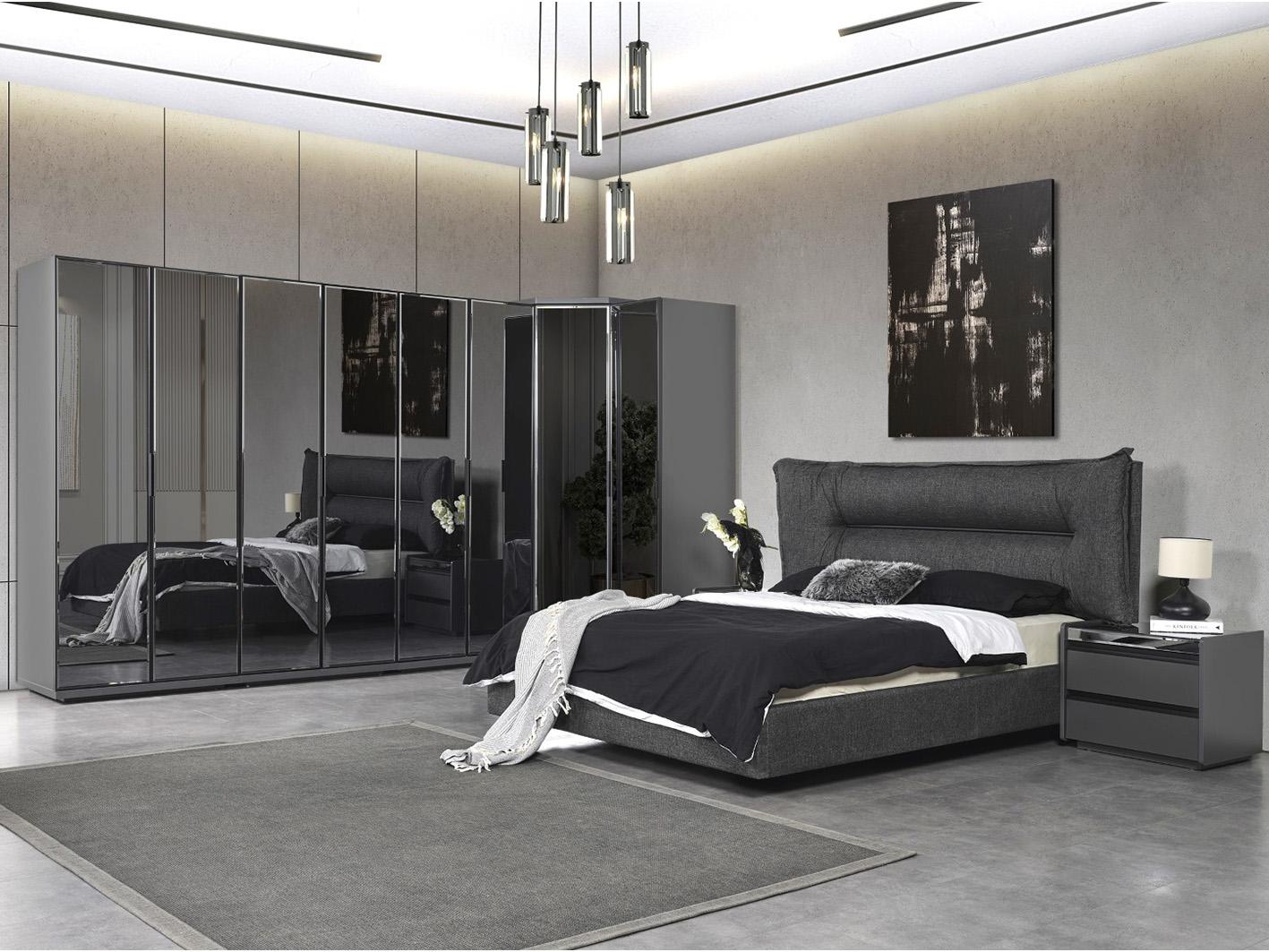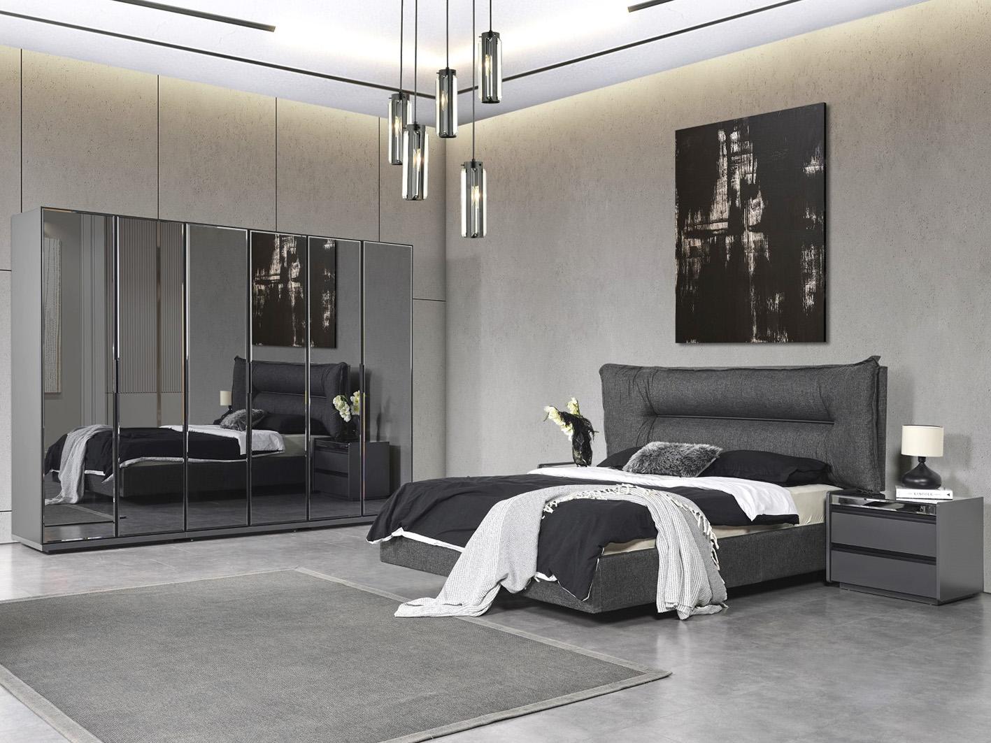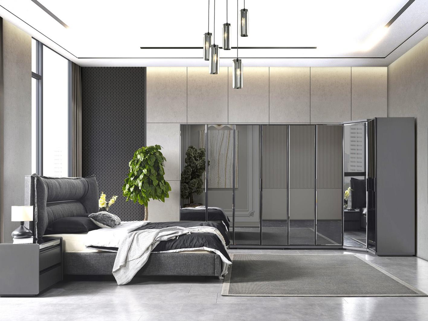 يبرز اللون رمادي داكن مائل للأسود الأنيق المدمج مع الخشب الطبيعي تفاصيل التصميم الفاخر، مما يضفي لمسة من الفخامة والرقي على غرفة النوم. سواء كنت تبحث عن غرفة توفر الراحة أو تعكس الذوق الكلاسيكي الممزوج بلمسات عصرية، فإن هذه الغرفة تلبي تطلعاتك.