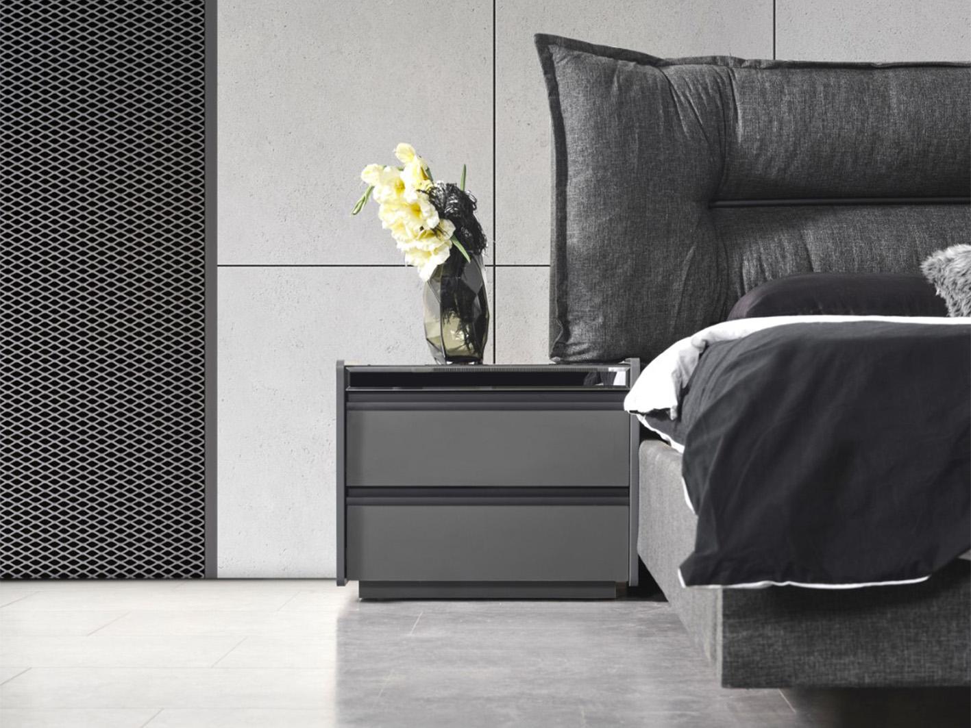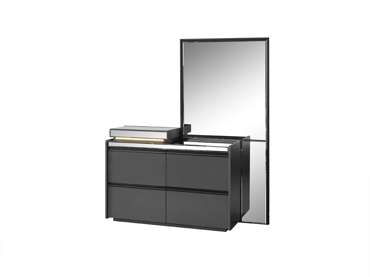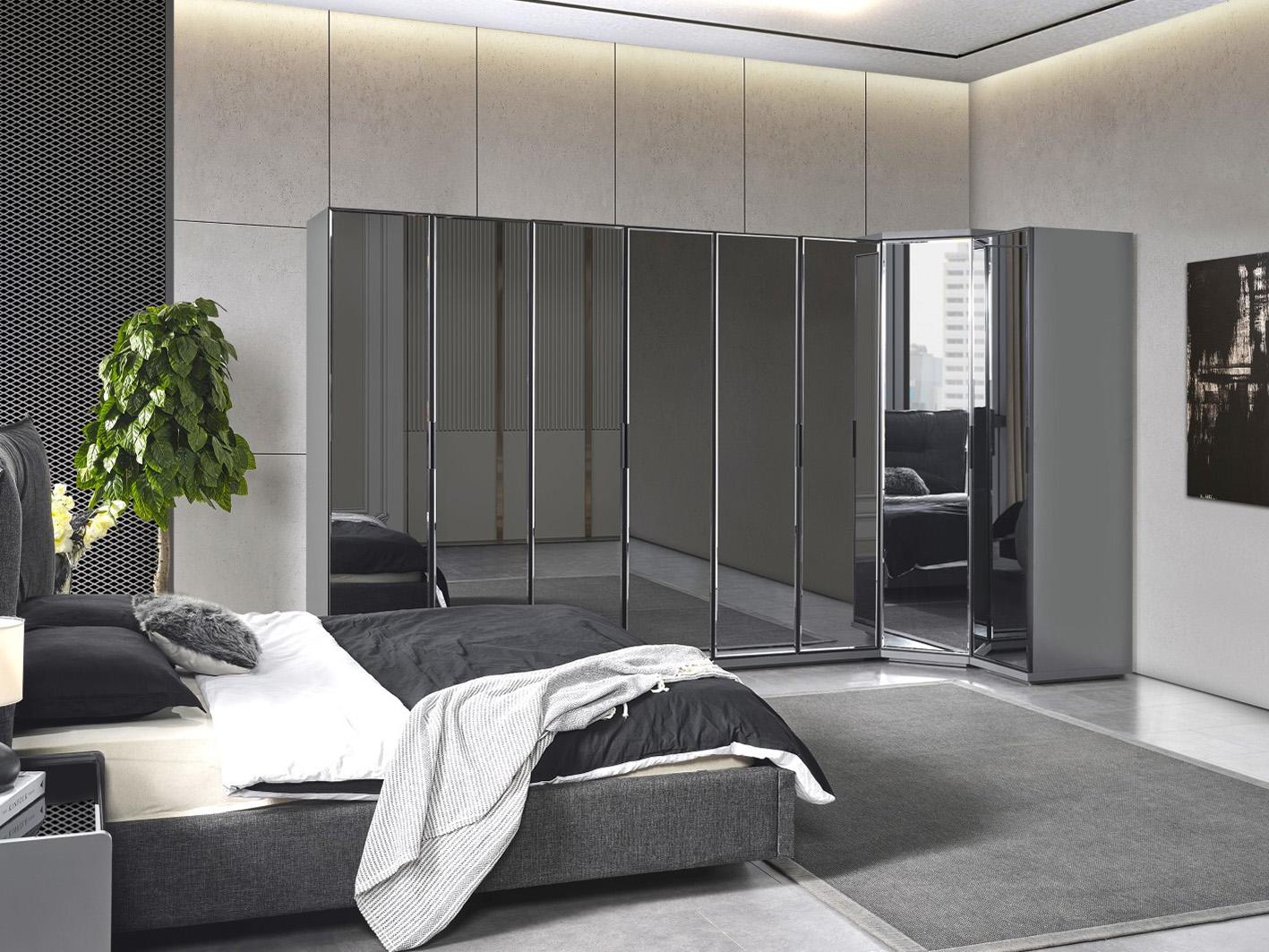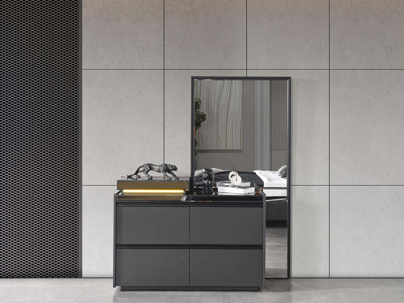 يبرز اللون رمادي داكن مائل للأسود الأنيق المدمج مع الخشب الطبيعي تفاصيل التصميم الفاخر، مما يضفي لمسة من الفخامة والرقي على غرفة النوم. سواء كنت تبحث عن غرفة توفر الراحة أو تعكس الذوق الكلاسيكي الممزوج بلمسات عصرية، فإن هذه الغرفة تلبي تطلعاتك.