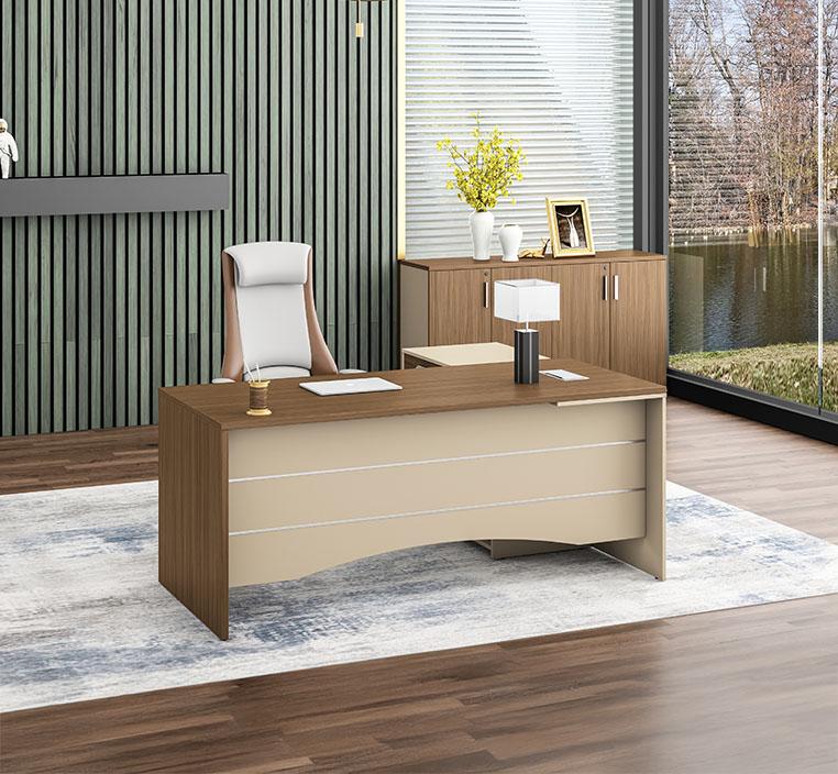 تم تصنيع المكتب باستخدام لوح خشبي صديق للبيئة من الدرجة E1 مع تشطيب ميلامين مستورد من علامة "Schattdecor"، لضمان مقاومة الخدوش والتآكل. يتميز المكتب بحواف PVC متينة بسُمك 2 ملم على السطح العلوي و1.2 ملم على الجوانب. السطح العلوي بسمك 25 ملم يمنح المكتب متانة فائقة تجعله مثاليًا للاستخدام اليومي المكثف.