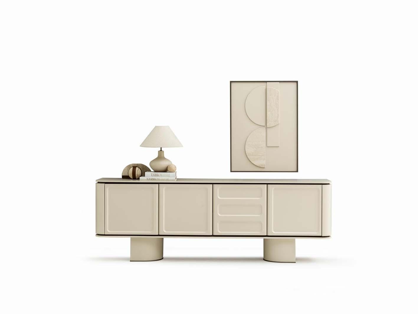 تفاصيل معمارية فريدة: القواعد الأسطوانية تضفي لمسة جمالية مميزة، مما يعزز جاذبية الكونسول ويضيف لمسة فنية للغرفة.