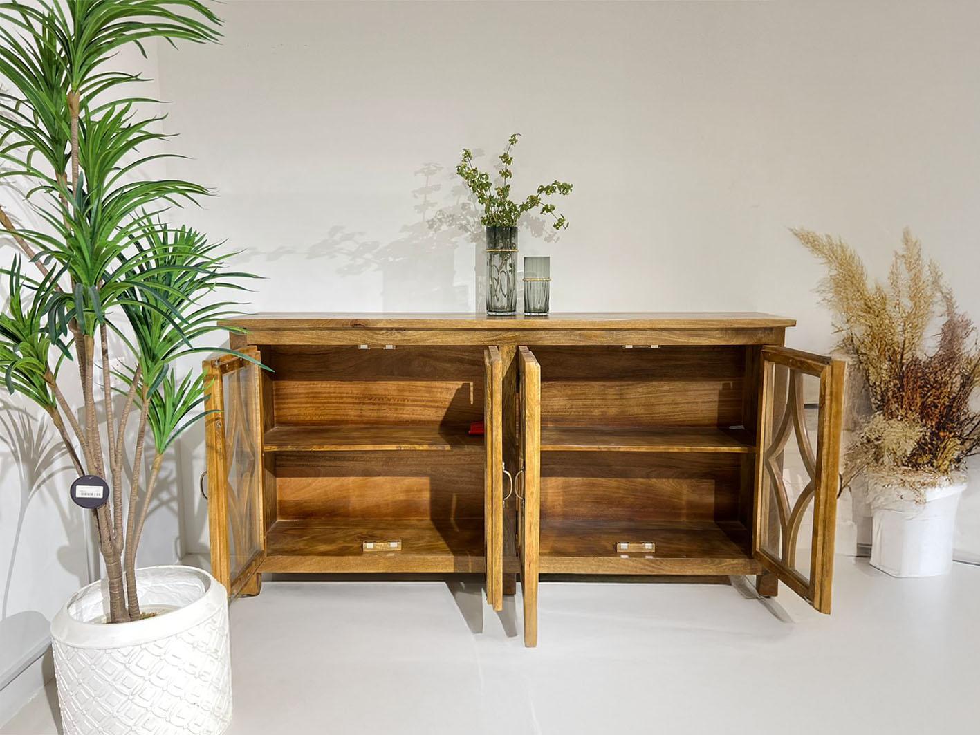 أضف لمسة فاخرة ودافئة إلى منزلك مع راڤي بوفيه خشب هندي المصنوع يدويًا في الهند. يتميز بتفاصيل دقيقة وتصميم هندسي رائع على الأبواب، يدمج بين الخشب الطبيعي والزجاج الشفاف.