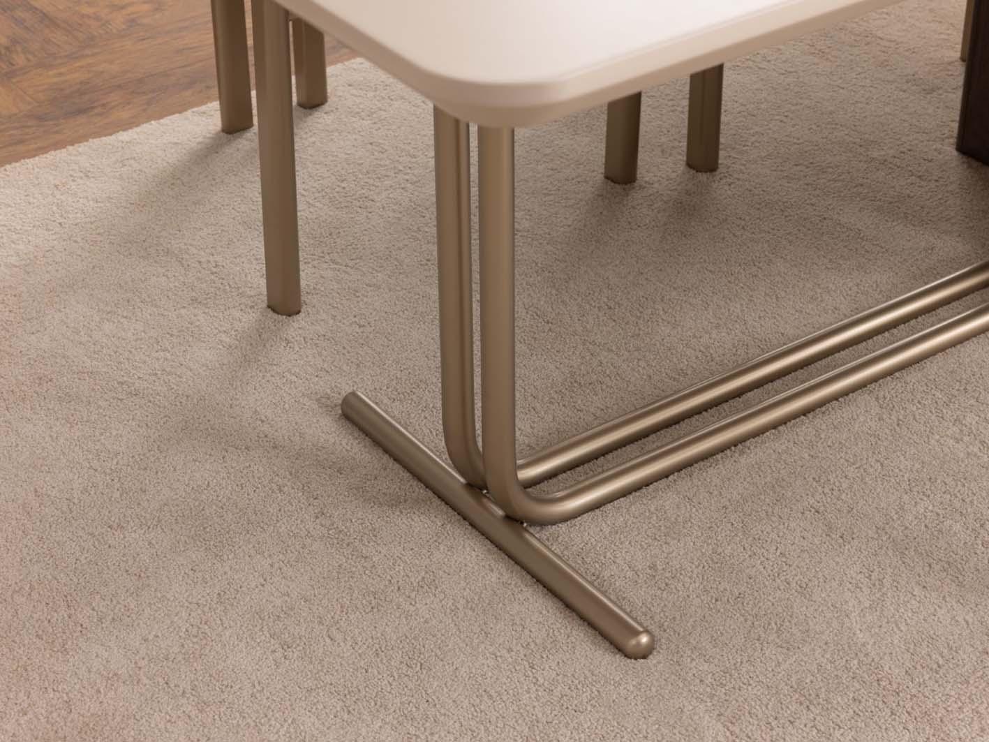 ويكتمل هذا التميز مع الأرجل المعدنية الجانبية المنحنية بتصميم عصري جذاب، والتي لا تضيف فقط لمسة جمالية حديثة، بل تعزز أيضاً من قوة التحمل وتمنح الطاولة توازناً مثالياً. كما يتيح هذا التصميم حرية الحركة حول الطاولة ويوفر راحة أكبر أثناء الجلوس، ليجعل تجربة الاستخدام أكثر سلاسة وانسيابية.