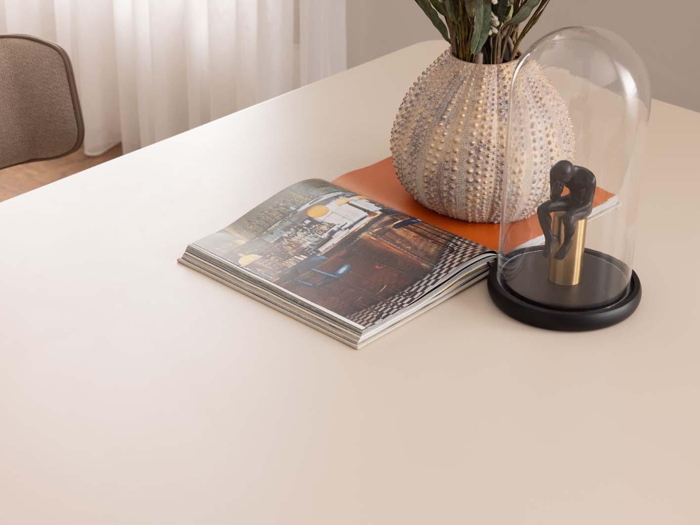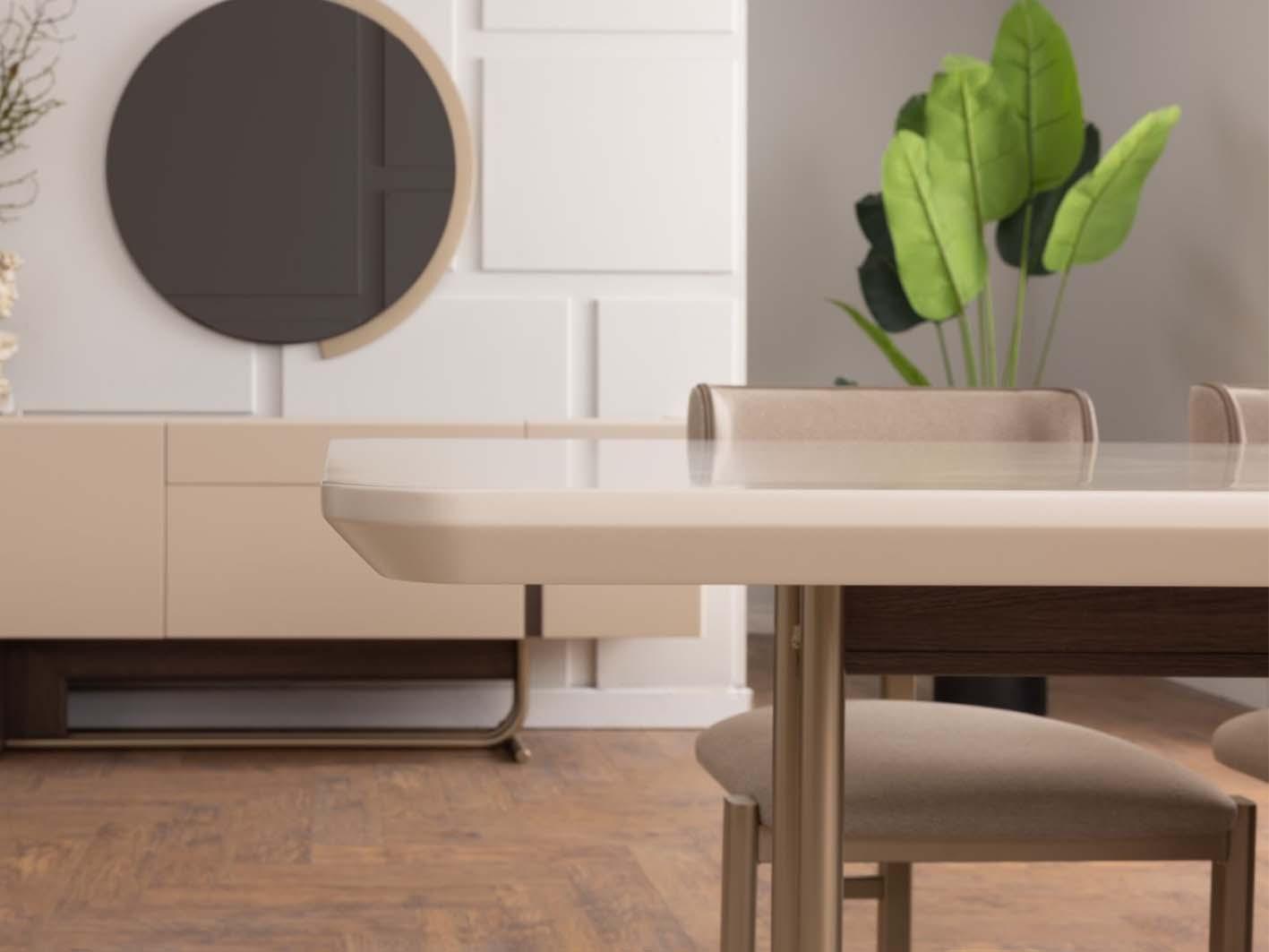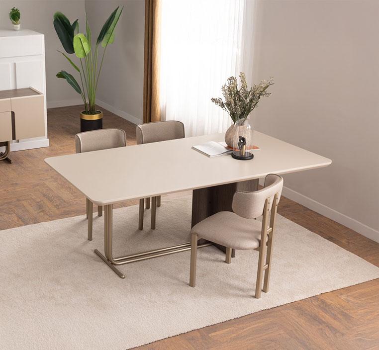يأتي سطح الطاولة بلون فاتح أنيق ولمسة ناعمة تضفي إشراقاً بصرياً على المكان، كما يساهم في خلق أجواء مريحة ومتناغمة أثناء الجلوس. يتميز السطح بمظهره العصري البسيط، ما يجعله سهل التنسيق مع مختلف ألوان كراسي الطعام والديكورات الداخلية، سواء كانت بأسلوب مودرن أو معاصر. كما أن خامته المختارة بعناية توفر متانة مناسبة للاستخدام اليومي، مما يجعل الطاولة خياراً مثالياً للتجمعات العائلية وموائد الضيافة.