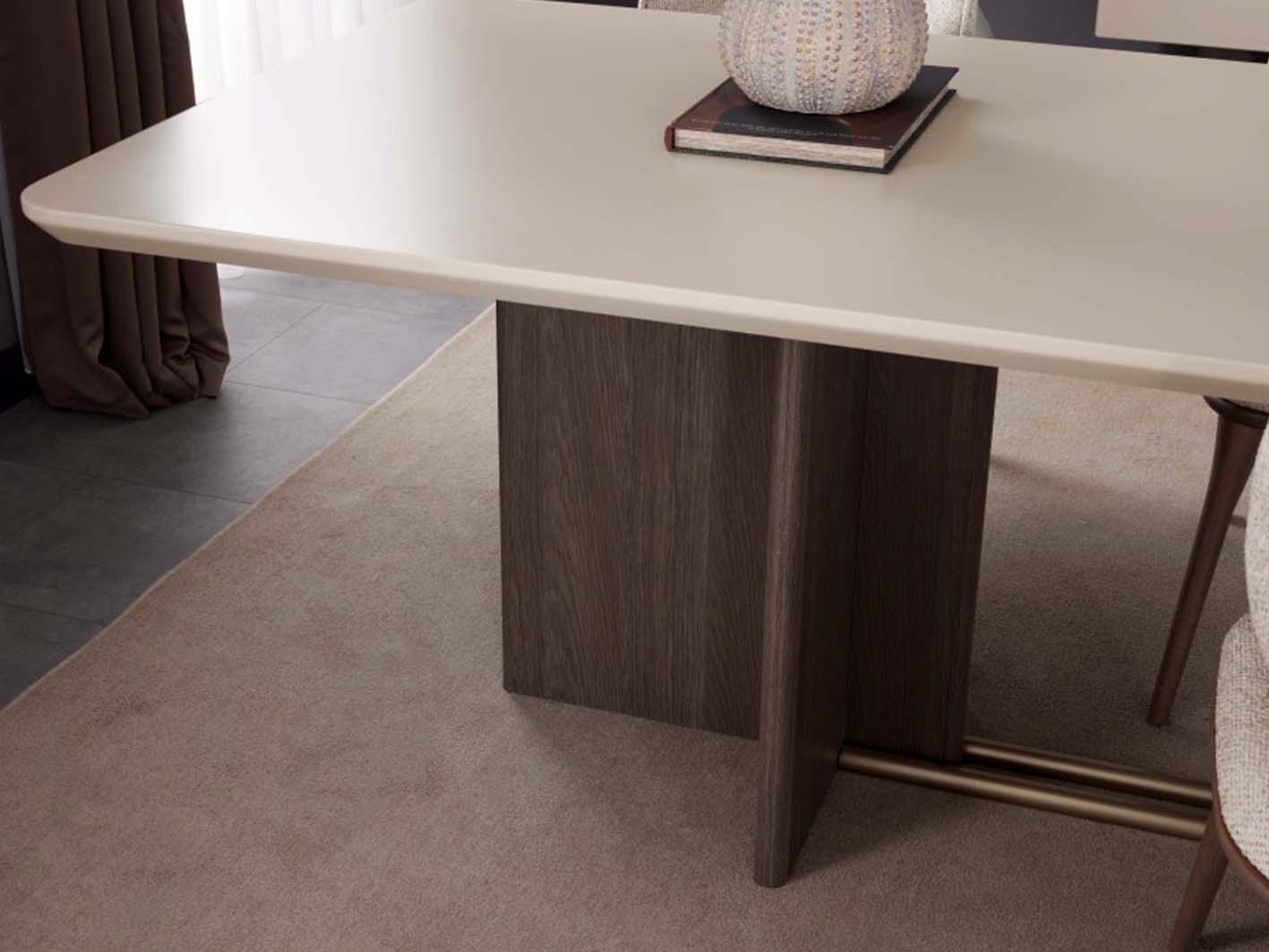 ويبرز جمال طاولة روزيتا في فلسفة تصميمها الذكية التي توازن بين الشكل والوظيفة، حيث تعتمد على قاعدة مركزية خشبية قوية تمنح الطاولة ثباتاً عالياً ومظهراً أنيقاً في الوقت نفسه. تضيف هذه القاعدة إحساساً بالدفء الطبيعي، وتبرز جمال تفاصيل الخشب ولمساته الراقية.