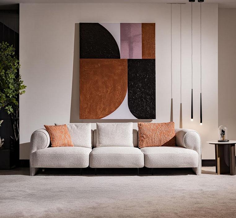 يأتي الكنب مغطى بخامة Boucle - Linen Blend بنسبة (%73 أكريليك، %16 بوليستر، %11 قطن)، لتمنح القماش ملمسًا ناعمًا ومتينًا في آنٍ واحد، مثالي للاستخدام اليومي.