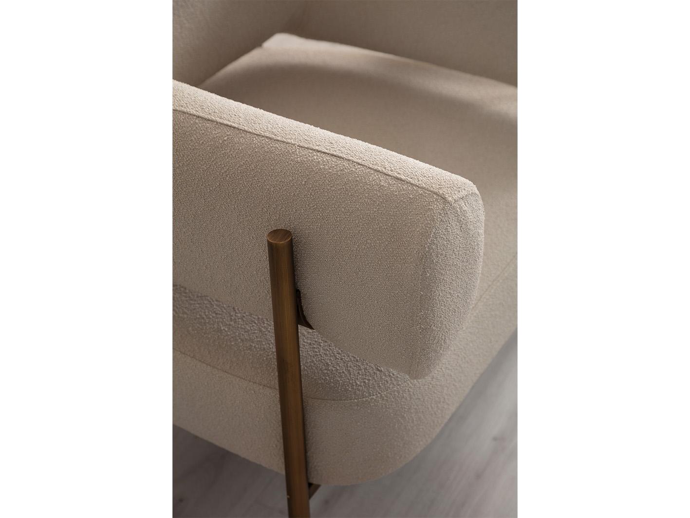 تم تصنيع هيكل الكرسي من خشب Plywood عالي الجودة، ما يمنحه متانة قوية وخفة في الوقت نفسه. الإطار مزوّد بتفاصيل أنيقة بتشطيب ذهبي غير لامع (Brushed Gold) يضفي لمسة فاخرة تناسب أرقى المساحات الداخلية.