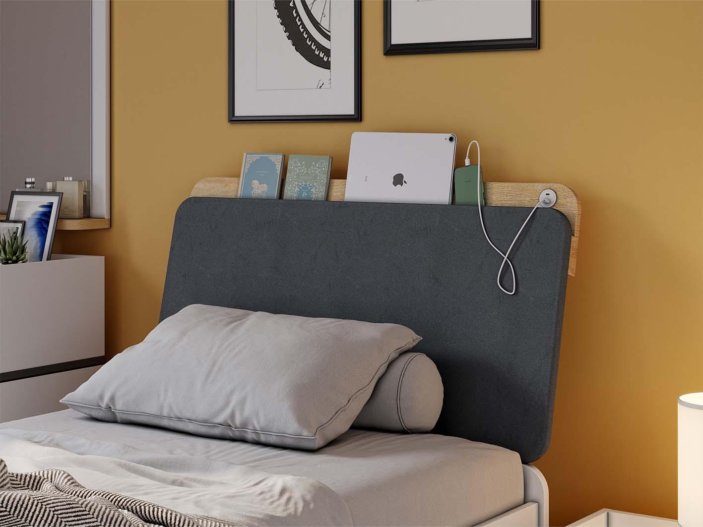 اللوح الأمامي مزود بتنجيد فاخر بلون أنثراسيت يضفي لمسة من الفخامة ويوفر دعماً مريحاً أثناء الجلوس أو الاسترخاء.