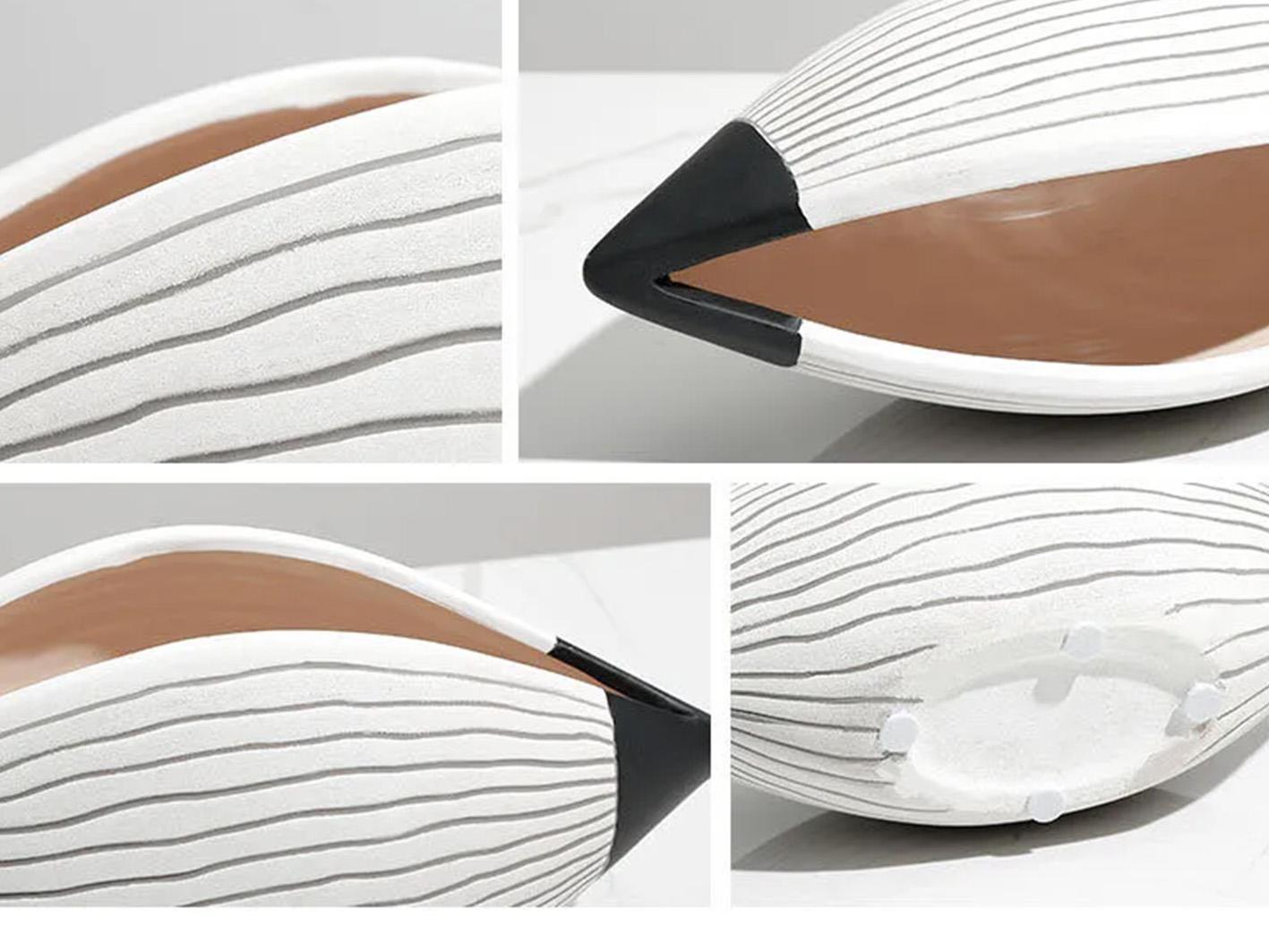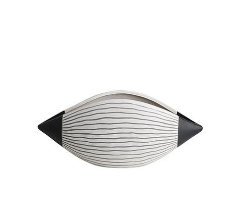 المنتج الموضح في الصورة عبارة عن وعاء أو مزهرية ذات تصميم عصري وجمالي مميز. يمتاز المنتج بشكل بيضاوي ممدود يشبه العين، مع أطراف مدببة بلون أسود لامع تضفي عليه مظهراً دراماتيكياً ومميزاً. الجسم الرئيسي للوعاء مصنوع من مادة بيضاء مع خطوط أفقية رفيعة ومتوازية باللون الأسود، والتي تمتد على طول سطح الوعاء، مما يخلق تأثيراً بصرياً أنيقاً ومريحاً للعين. يبدو أن الوعاء قد تم تصميمه بعناية فائقة حيث تتداخل الخطوط الدقيقة بطريقة منتظمة، ما يضفي عليه لمسة من الرقي والبساطة في آن واحد. استخدام الألوان المتناقضة بين الأبيض والأسود يجعل هذا المنتج يتماشى بسهولة مع مجموعة متنوعة من أنماط الديكور الداخلي، سواء كان ذلك في المنازل الحديثة أو المساحات المكتبية الأنيقة. هذا الوعاء يمكن استخدامه كقطعة مركزية على طاولة الطعام أو الرفوف، أو حتى كمزهرية لعرض الزهور الطازجة أو الاصطناعية. بفضل تصميمه الفريد والجذاب، يمكن لهذا المنتج أن يكون إضافة رائعة لأي غرفة، مما يعزز من جماليات المكان ويجذب الأنظار بسهولة. بشكل عام، يعد هذا الوعاء أو المزهرية خياراً مثالياً لأولئك الذين يبحثون عن قطعة ديكور فنية تجمع بين البساطة والأناقة، وتضفي لمسة مميزة على ديكورهم الداخلي.