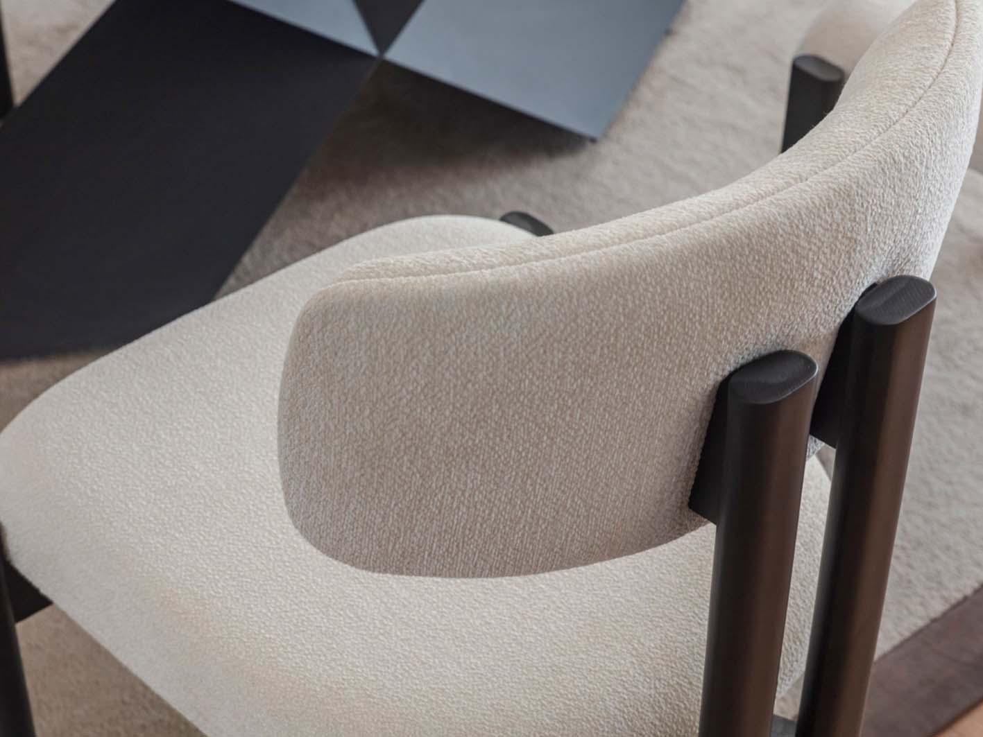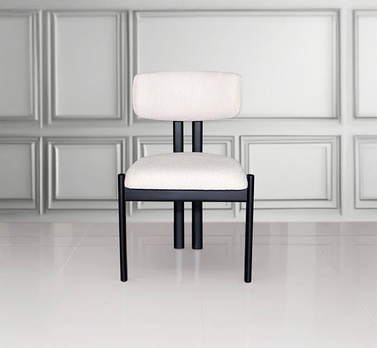 الهيكل مصنوع من الخشب السولد الأسود المتين، ما يضمن لك استدامة وصلابة تدوم لسنوات طويلة. أما المقعد والظهر، فقد تم تنجيدهما باستخدام قماش البوكلية الفاخر بلون أبيض هادئ، مما يوفر لك الراحة والدعم أثناء الجلوس لفترات طويلة. بفضل تصميمه المريح والمبطن، يتيح لك الكرسي الشعور بالراحة أثناء تناول الطعام أو الاسترخاء، كما يمكن استخدامه في أماكن متعددة مثل غرف الجلوس والمكاتب المنزلية وحتى غرف النوم.