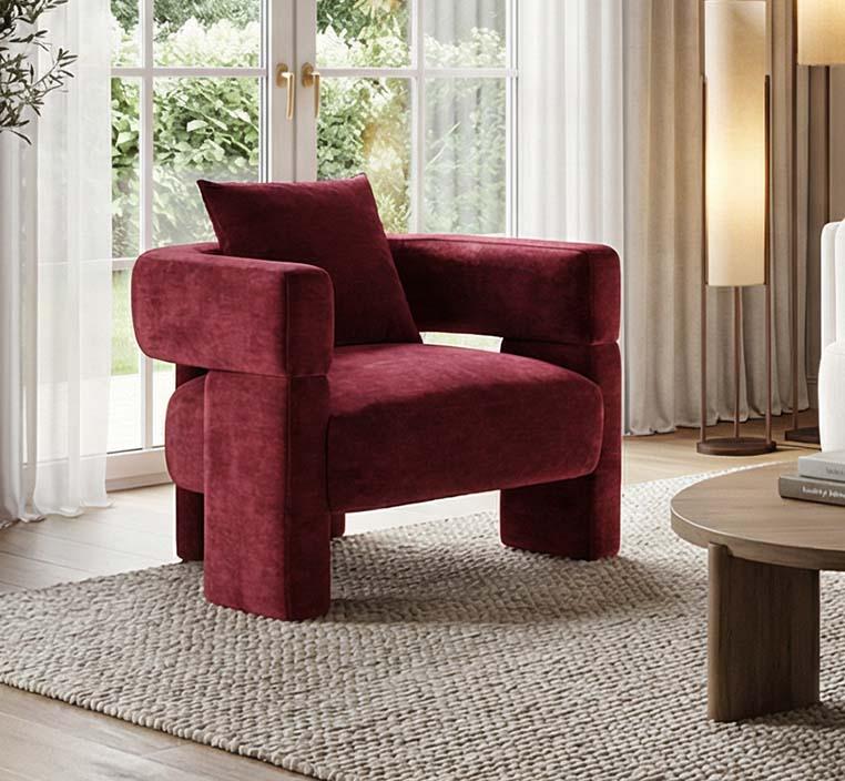 تم تصميم كرسي غرفة المعيشة ليكسا بعناية ليمنحك توازناً مثالياً بين الشكل والوظيفة. خطوطه الناعمة وتفاصيله الدقيقة تعكس حسًا فنيًا راقيًا، بينما يضمن الإطار الخشبي المتين الثبات والجودة لسنوات طويلة. كما يضفي المخمل العنابي الفاخر ملمسًا ناعمًا ومظهرًا غنيًا يعزز من جمال الغرفة ويجعل قطعة الأثاث هذه نقطة جذب رئيسية في أي مساحة.