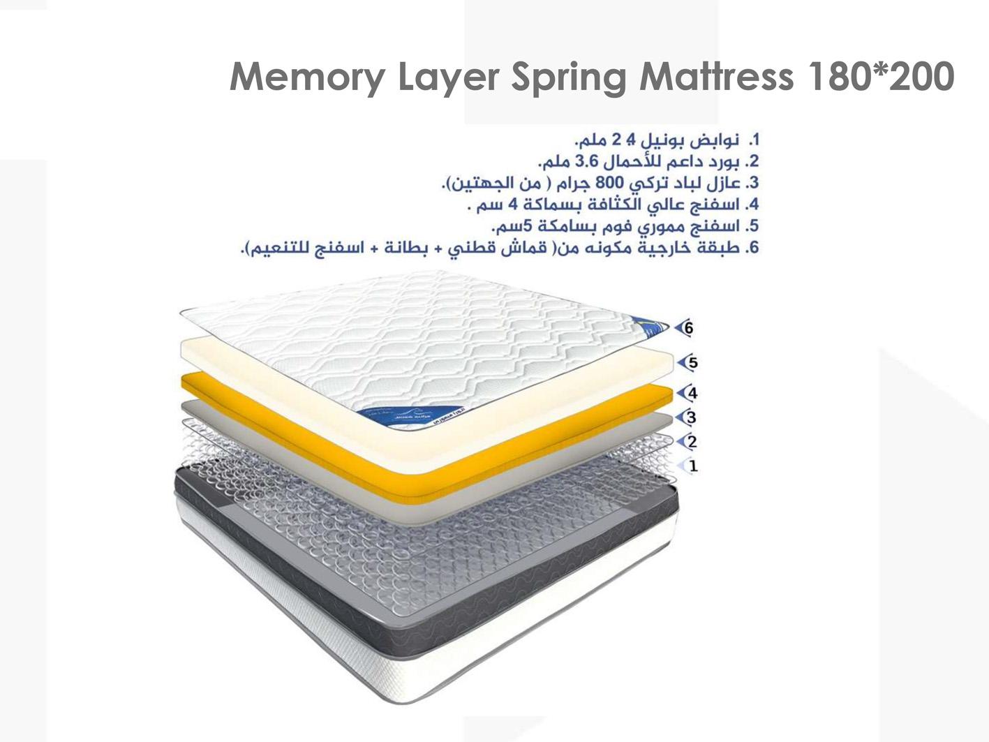 ارتقِ بتجربة نومك إلى مستوى جديد من الفخامة والراحة مع مرتبة 180*200 ميموري أسبرنج، المصممة بأحدث التقنيات لتوفير الدعم المثالي والراحة الفائقة. تتألف هذه المرتبة من ست طبقات متميزة، تقدم كل واحدة منها ميزة فريدة لتحقيق أفضل تجربة نوم ممكنة.
