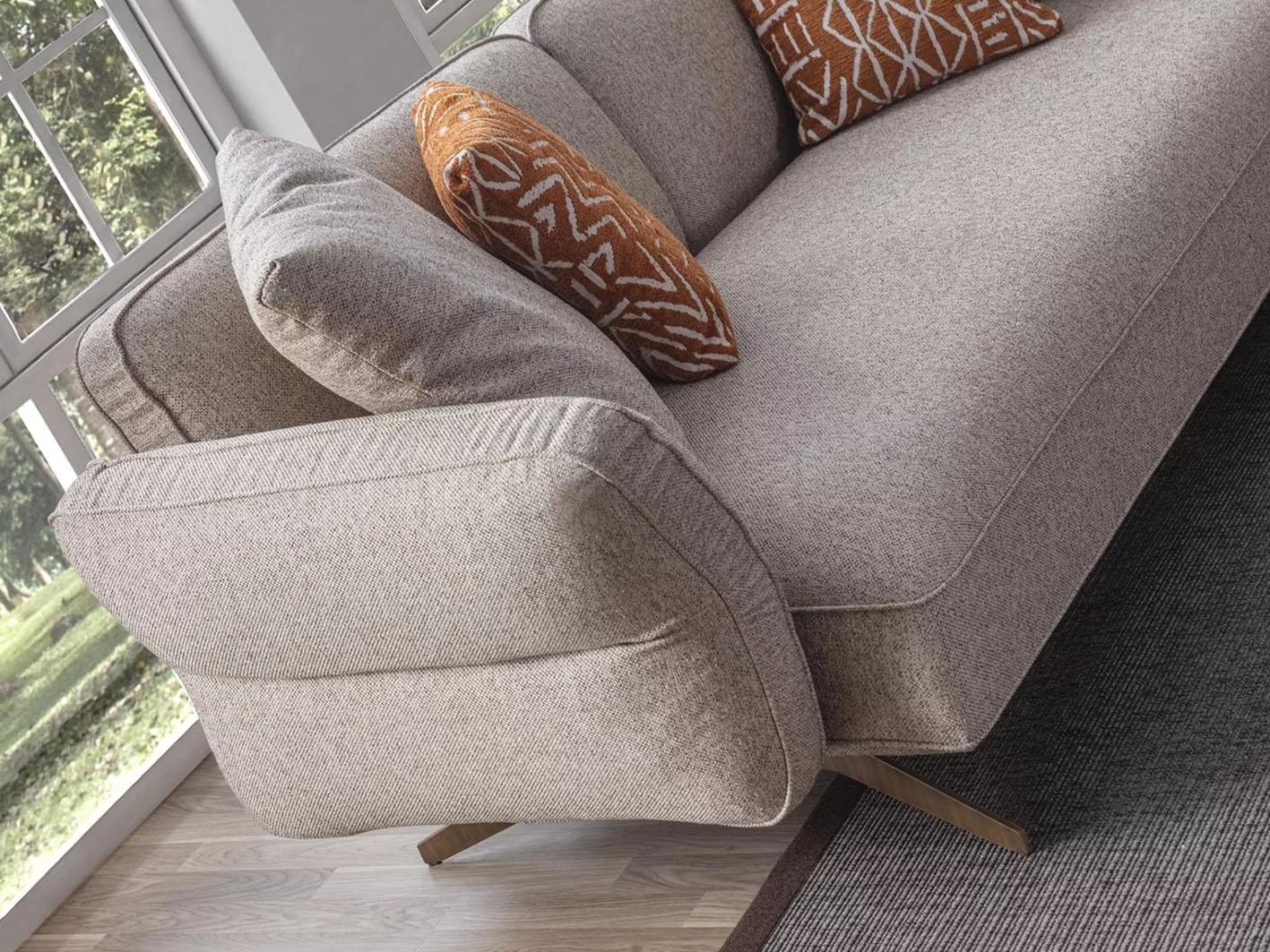 تم تنجيد الأريكة باستخدام قماش البوكليه الناعم والمتين، المعروف بملمسه الفاخر ومقاومته للاستخدام اليومي، مع تفاصيل تضيف إحساسًا بالدفء والراحة.