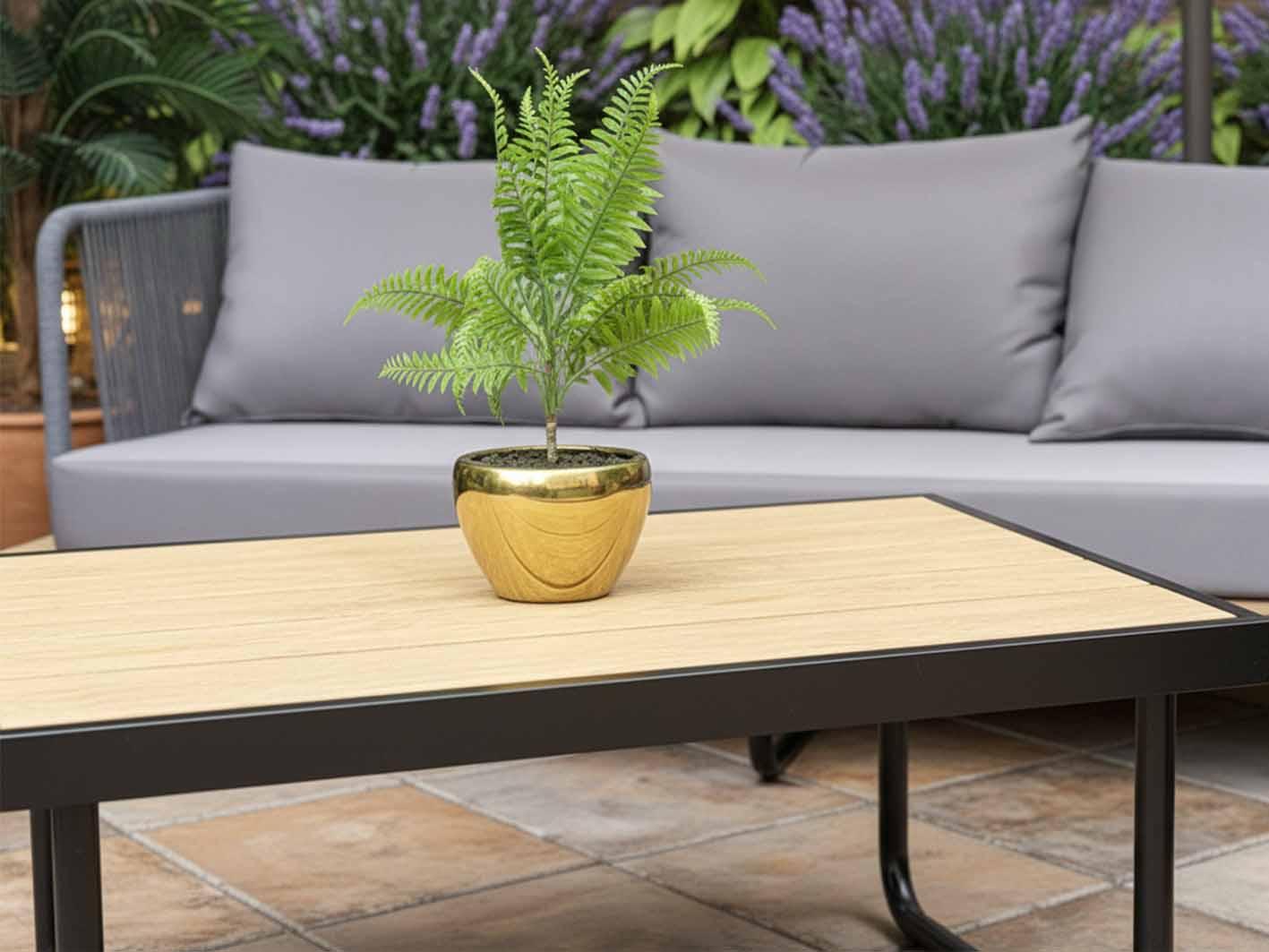 تأتي الطاولة بتصميم أنيق بسطح بلون خشبي فاتح يمنح الجلسة مظهرًا دافئًا وطبيعيًا، ويضيف لمسة من التباين الجميل مع الهيكل الرمادي. السطح الخشبي سهل التنظيف ومقاوم للخدوش، مما يجعله مثاليًا لوضع المشروبات والوجبات الخفيفة والإكسسوارات الخارجية.