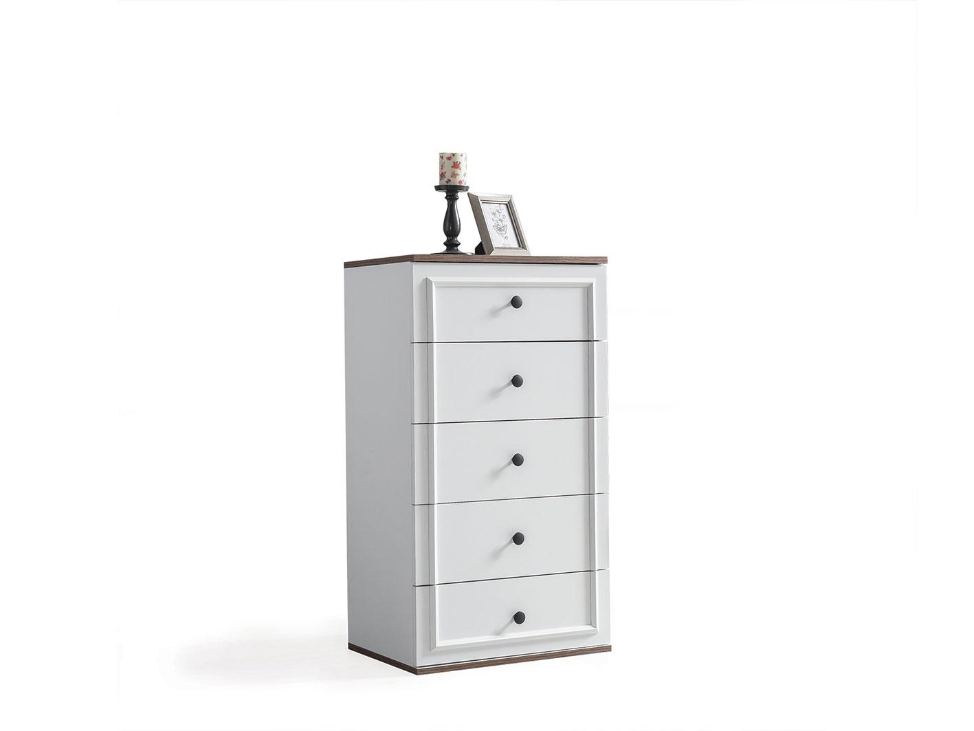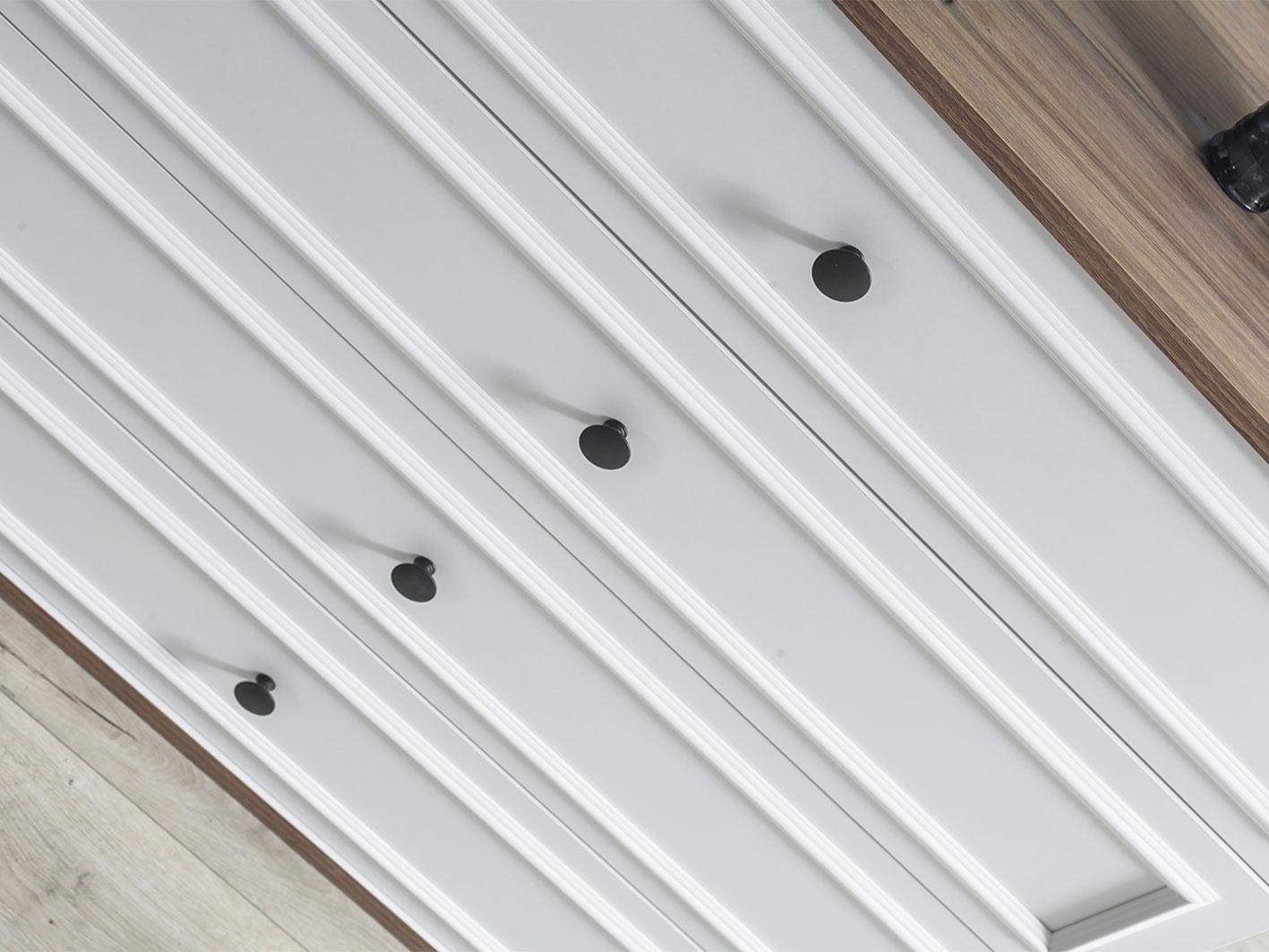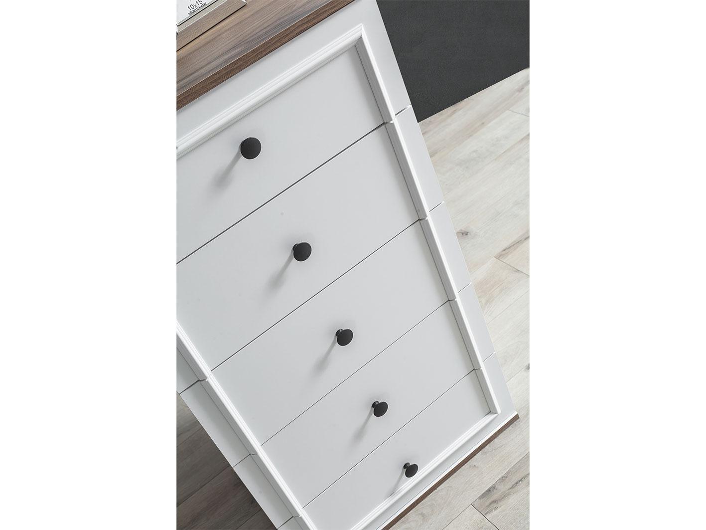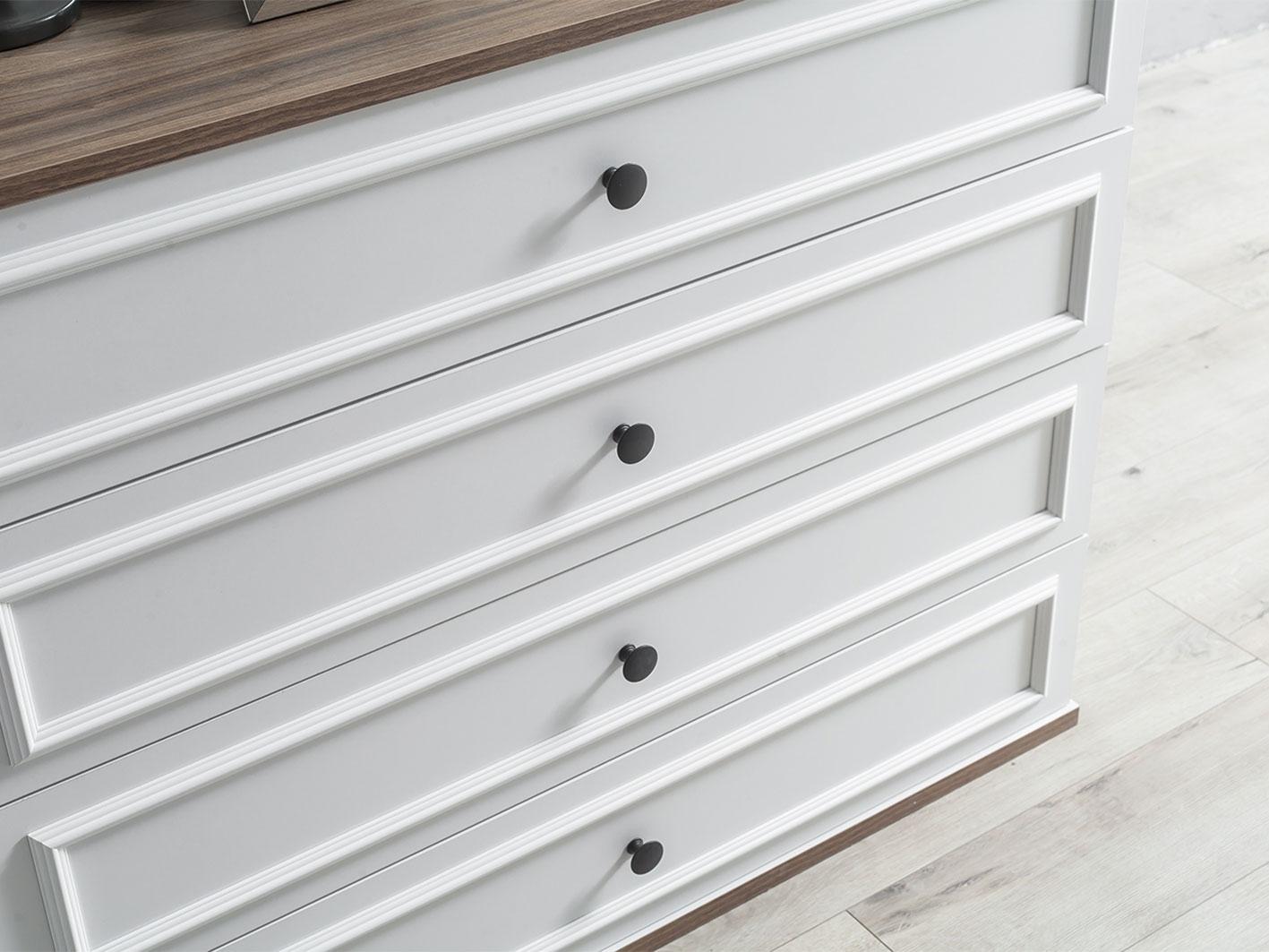 وحدة أدراج إضافية: تحتوي الغرفة على وحدة أدراج بخمس أدراج، مما يضيف مساحة تخزين إضافية، مع تصميم متناسق ومقابض معدنية مقاومة باللون الأسود تعزز من الطابع العصري والمتانة.