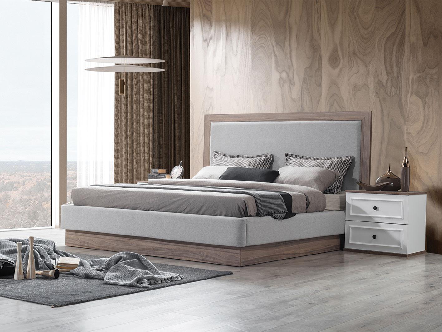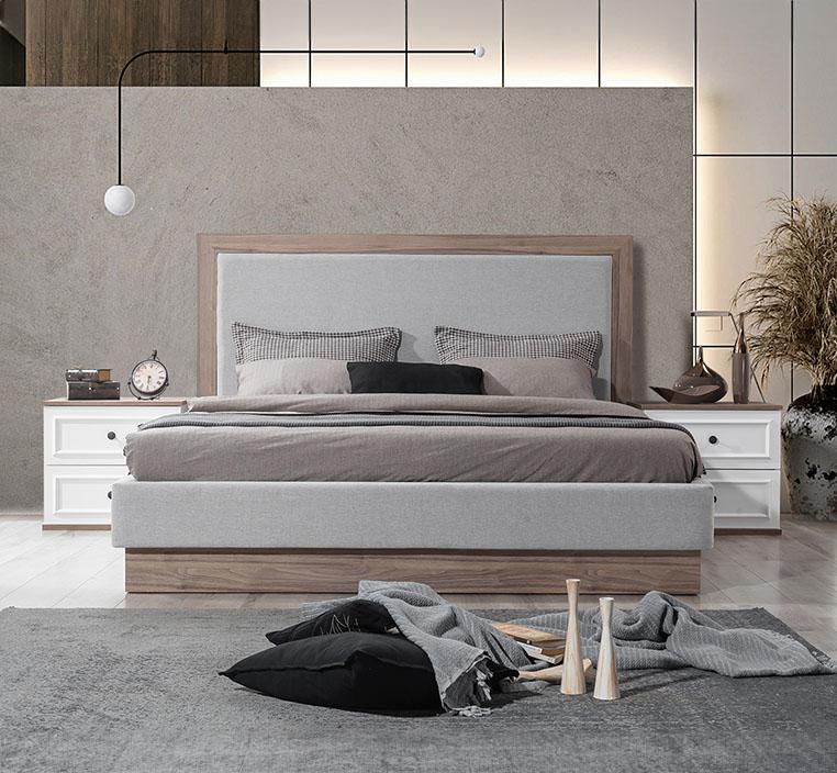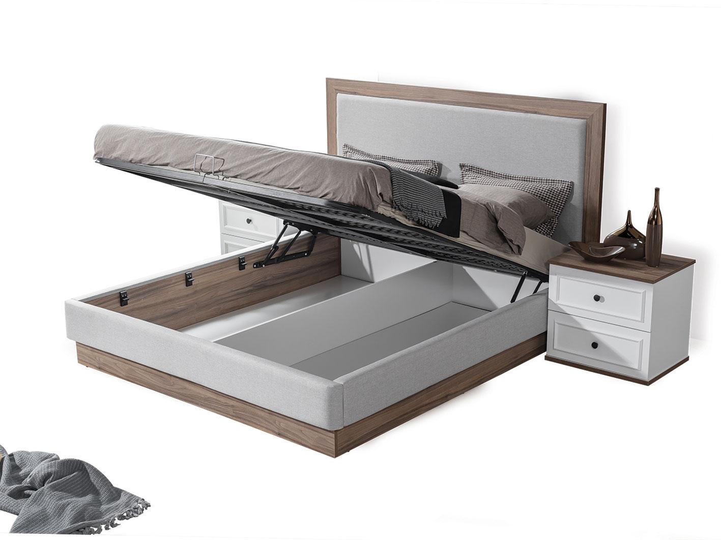 سرير فاخر مع تخزين هيدروليكي: السرير منجد بالقماش الفاخر ليضيف لمسة من الراحة والأناقة مع إطار خشبي باللون البني يعزز من متانة وجمال التصميم. كما يتميز السرير بمساحة تخزين داخلية واسعة بنظام هيدروليكي يسهل الوصول إليها.