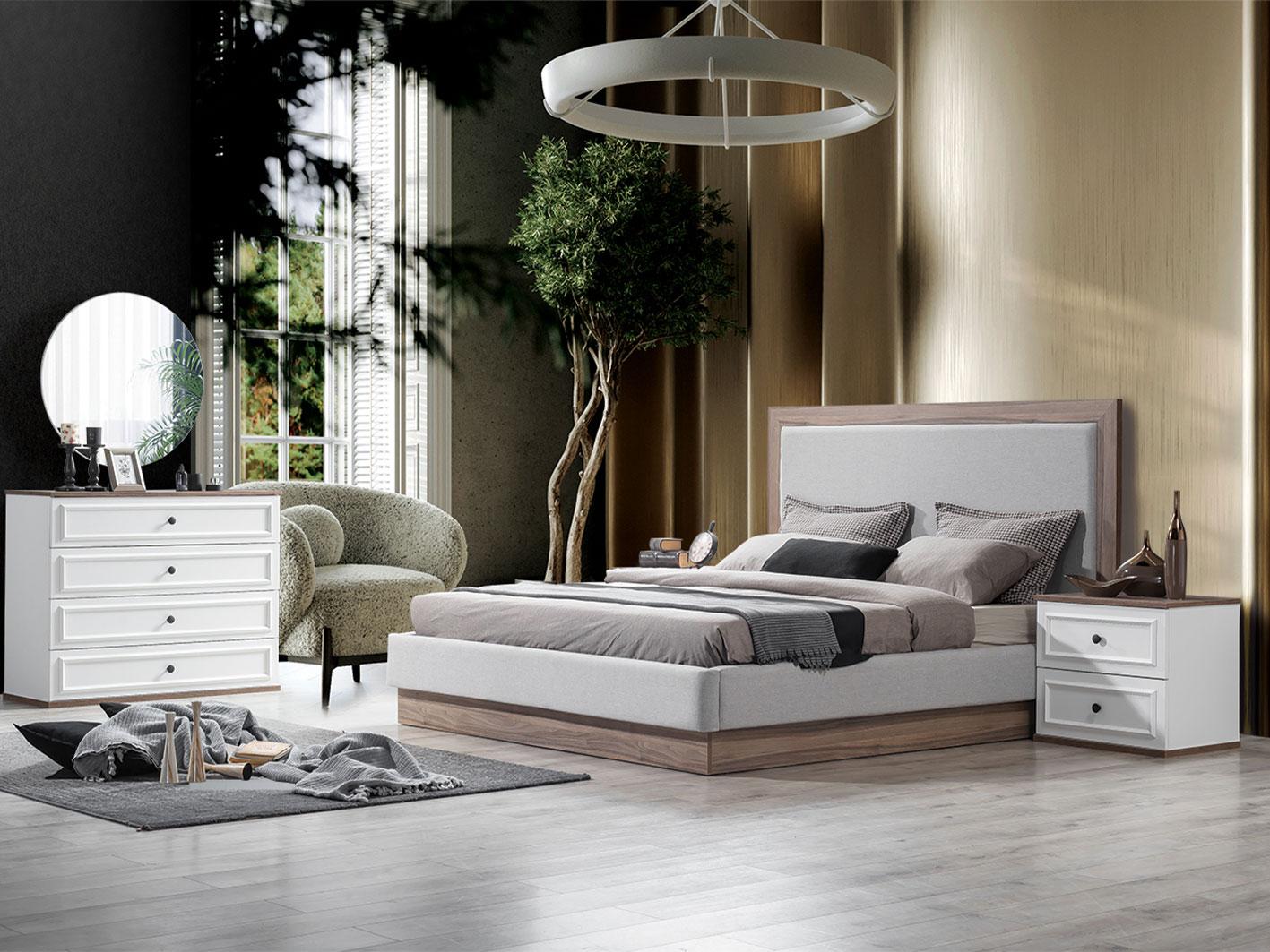 طقم غرفة نوم فاخر زيتا يجسد الأناقة العصرية مع لمسات من الدفء والراحة، مما يجعله الاختيار الأمثل لكل من يبحث عن تصميم مميز ووظائف عملية. مصنوعة بدقة من ألواح MDF عالية الجودة مع تشطيب ميلامين مقاوم للخدوش والرطوبة، تجمع بين اللون البني الدافئ والأبيض النقي لإضفاء جمالية استثنائية على غرفة النوم.