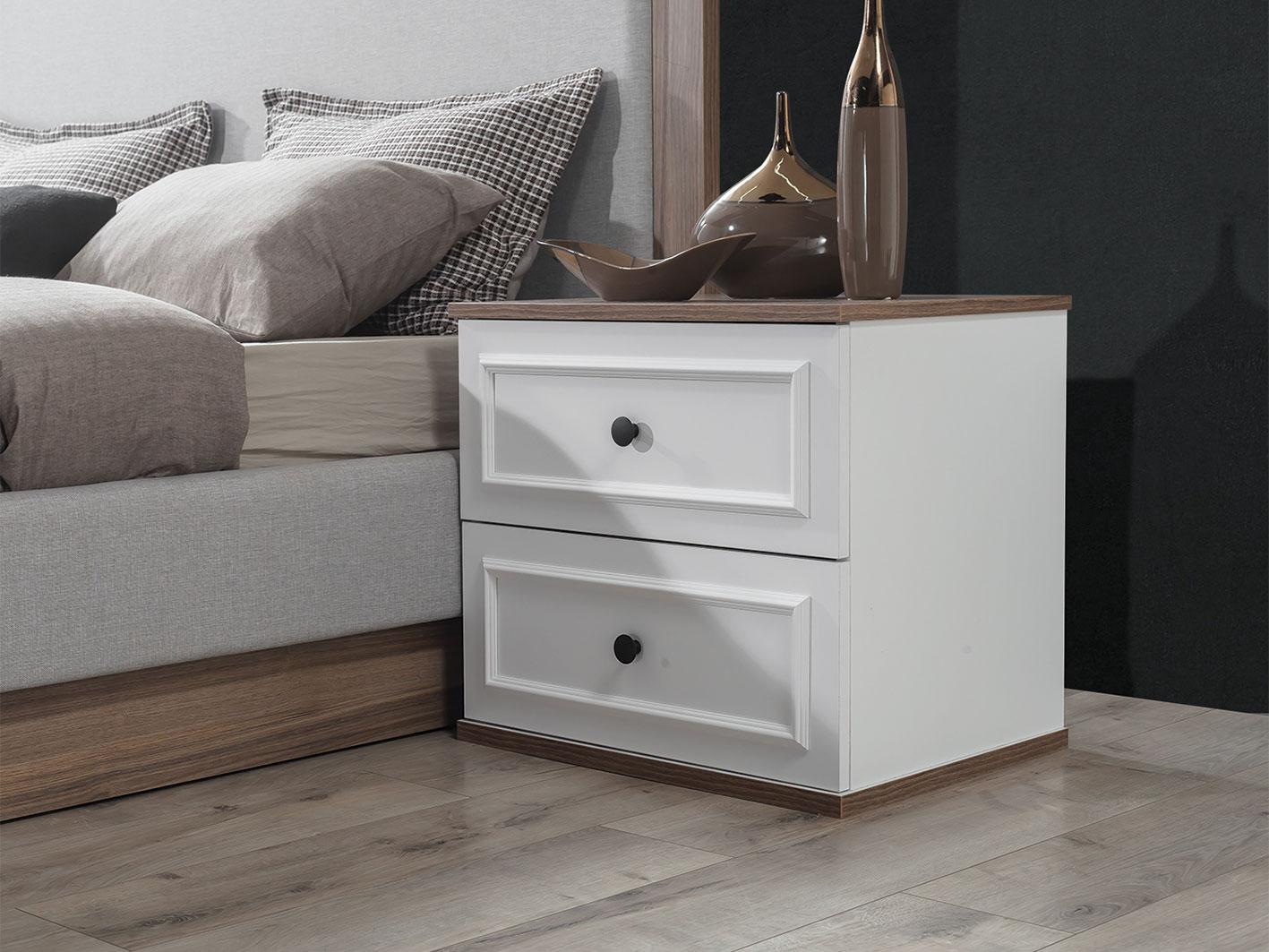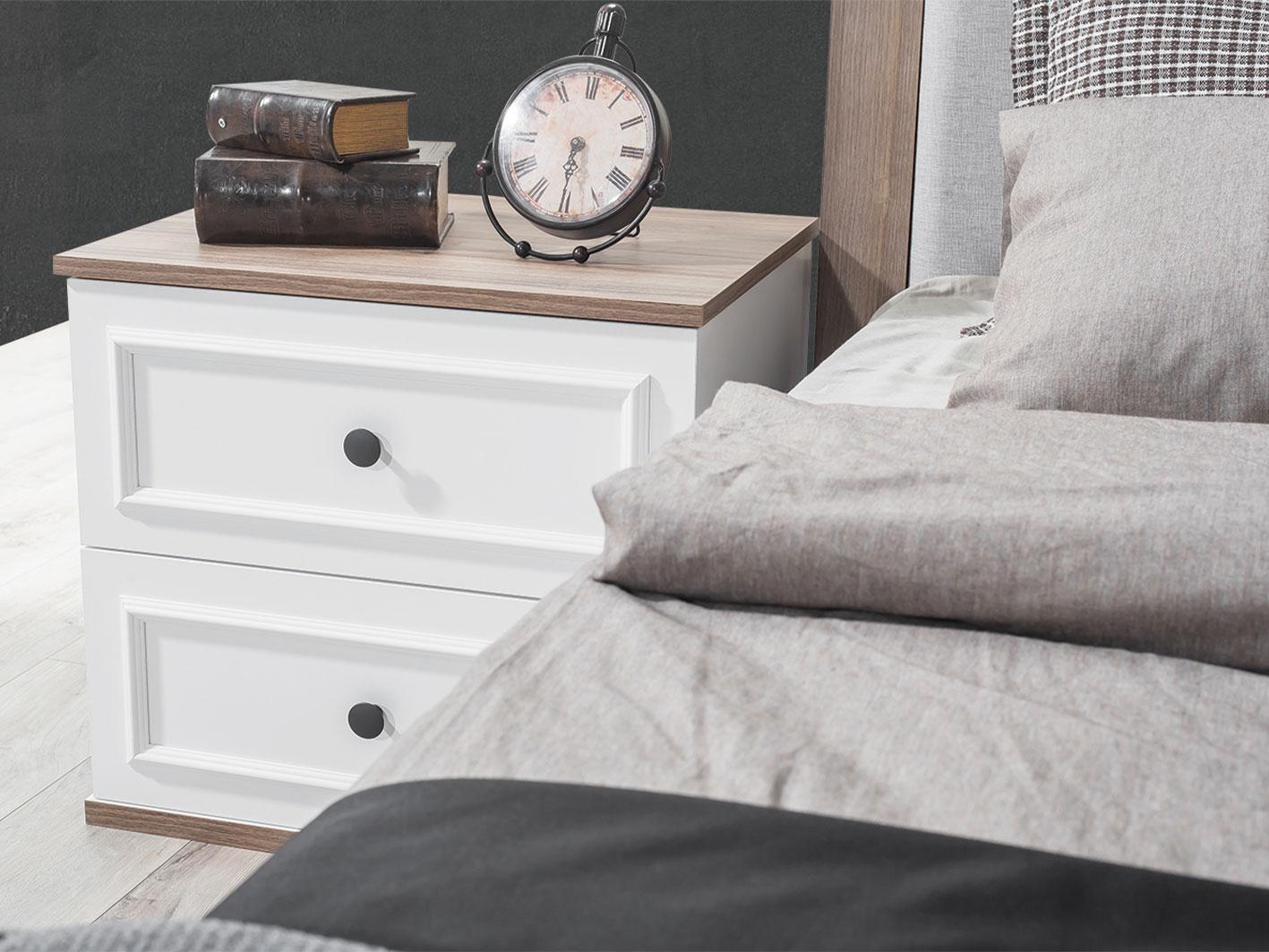 طاولات جانبية عملية: يأتي طقم زيتا مع طاولتين جانبيتين بتصميم أنيق وعصري، باللون الأبيض مع سطح بني متناسق. توفر هذه الطاولات مساحات مثالية لوضع أغراضك الشخصية مثل الكتب أو الهاتف أو حتى ديكورات صغيرة.