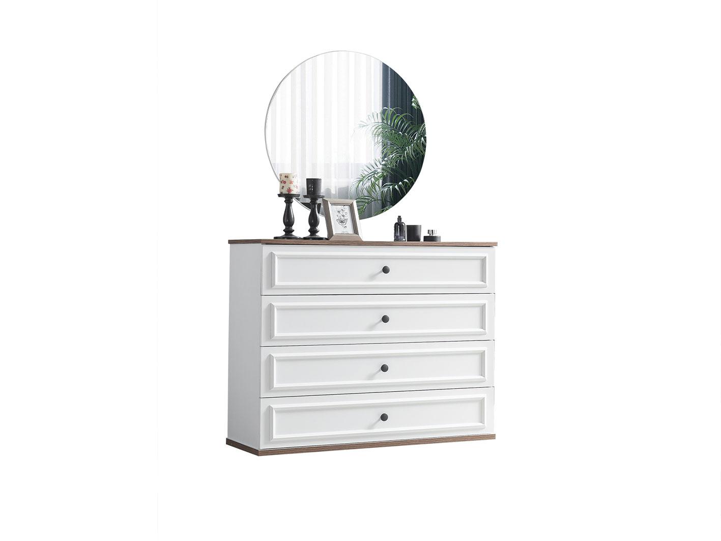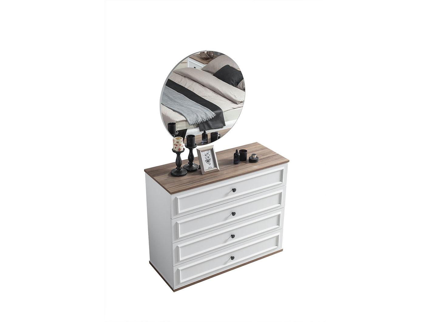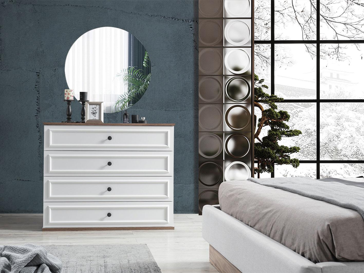 تسريحة واسعة مع مرآة: تسريحة مكونة من 4 أدراج واسعة، توفر لك المساحة المثالية لتخزين مستلزماتك اليومية. تأتي التسريحة مع مرآة دائرية تضيف لمسة من الأناقة والبساطة إلى الغرفة، مما يجعل روتينك اليومي أكثر سهولة وأناقة.