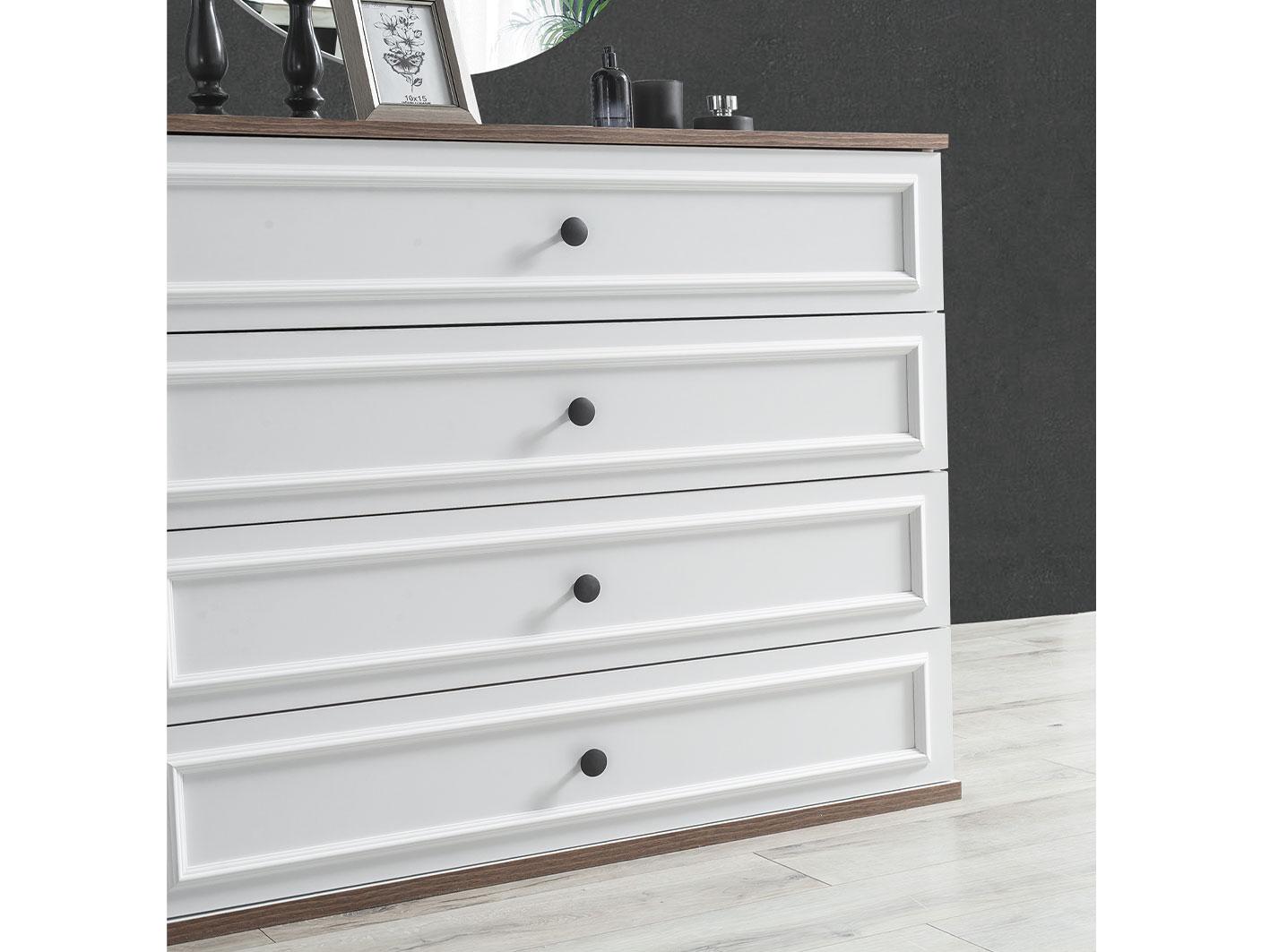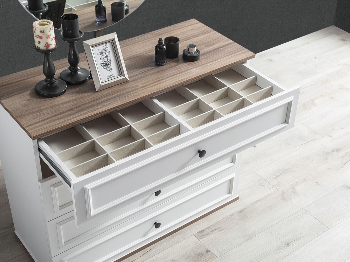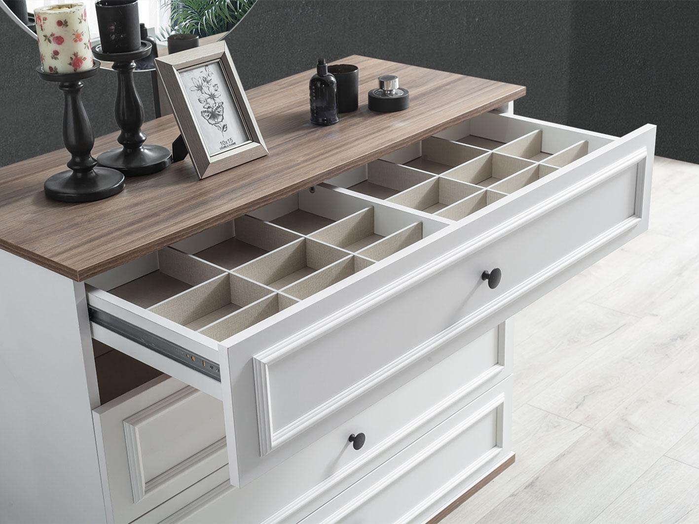تسريحة واسعة مع مرآة: تسريحة مكونة من 4 أدراج واسعة، توفر لك المساحة المثالية لتخزين مستلزماتك اليومية. تأتي التسريحة مع مرآة دائرية تضيف لمسة من الأناقة والبساطة إلى الغرفة، مما يجعل روتينك اليومي أكثر سهولة وأناقة.